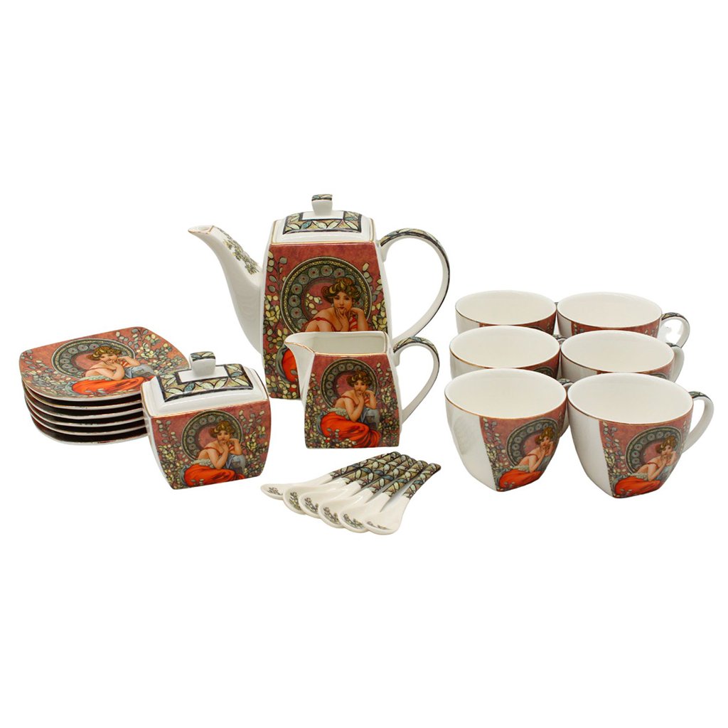 Veľká porcelánová čajová sada pre 6 osôb, dekor z diel Alfonsa Muchu, hnedý odtieň, balené v darčekovej škatuľke.