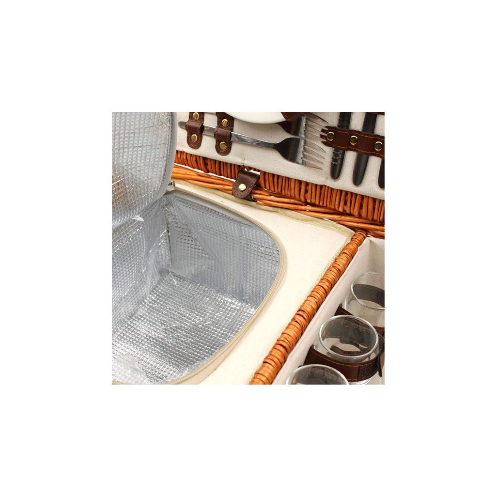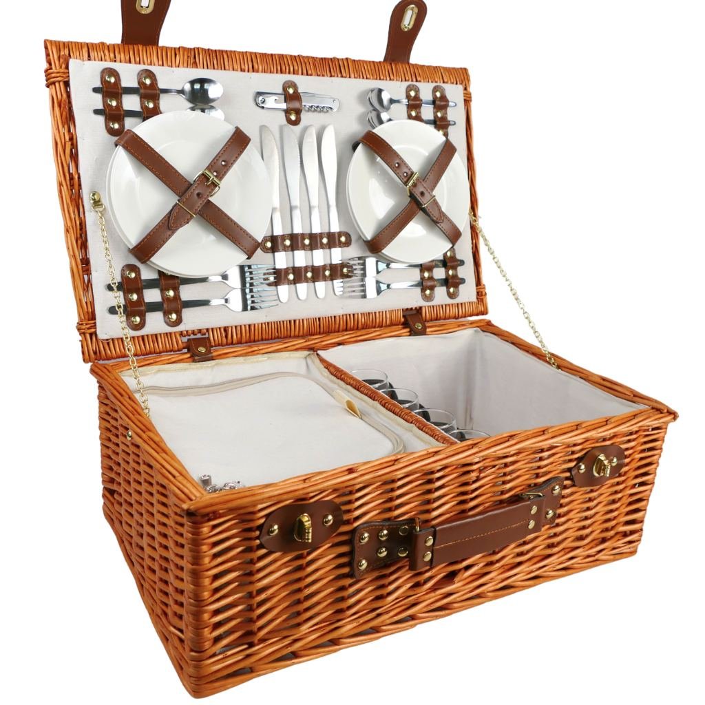 Prútený piknikový kôš pre 4 osoby na skvelé raňajky, obed alebo aj večeru v tráve. Kôš je dokonale pripravený na správny piknik. Vo vnútri nájdete všetko potrebné: taniere, poháre a vývrtku na víno. Užite si príjemné chvíle s rodinou alebo priateľmi.