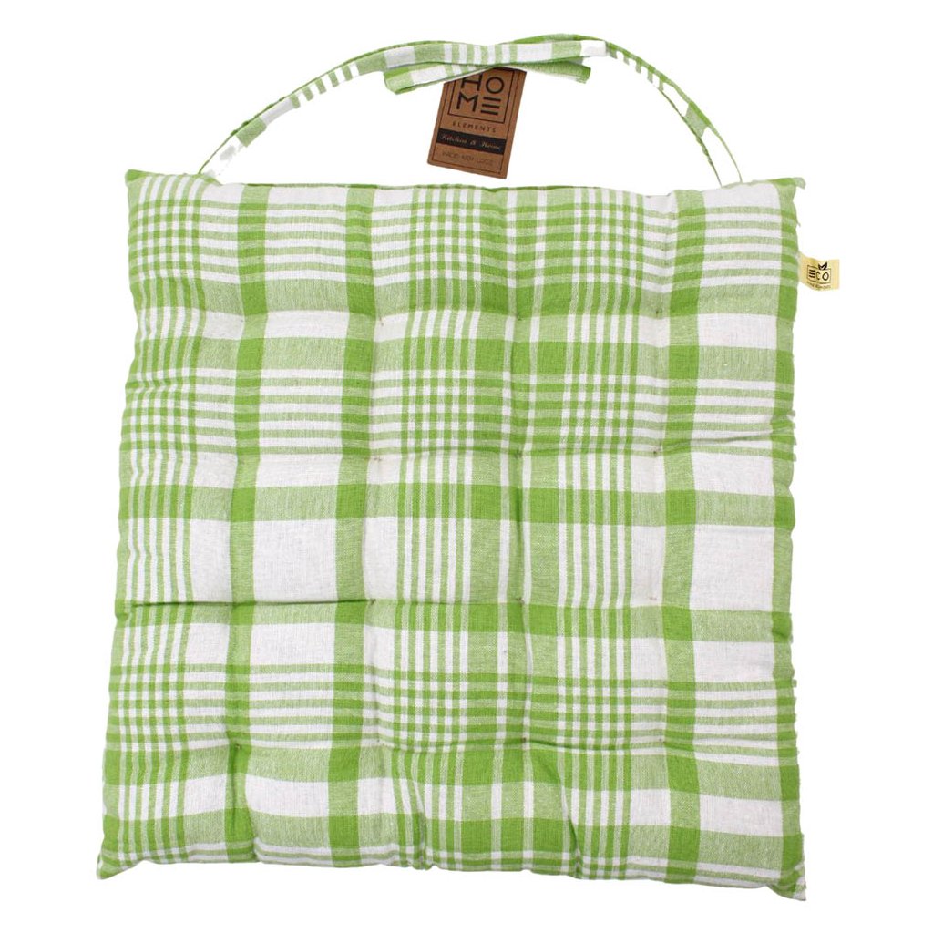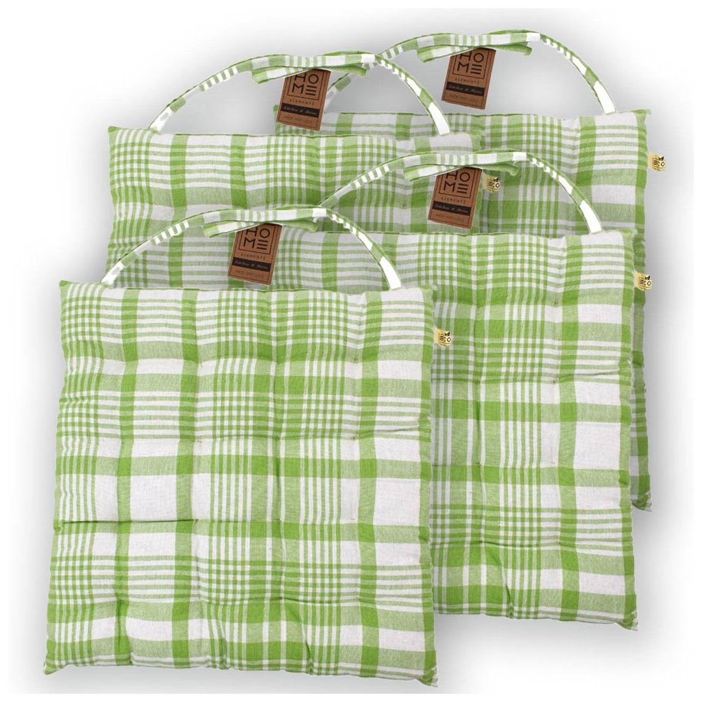 Pohodlný vankúš na sedenie do kuchyne alebo na záhradu. Súprava 4 vankúšov na sedenie s károvaným vzorom v zelenej a bielej farbe. Skvelý útulný bytový doplnok, ktorý zvýši vaše pohodlie pri sedení a ochráni vás pred chladom. Vankúš na sedenie je pripevnený k stoličke pomocou šnúrok v rovnakej farbe.