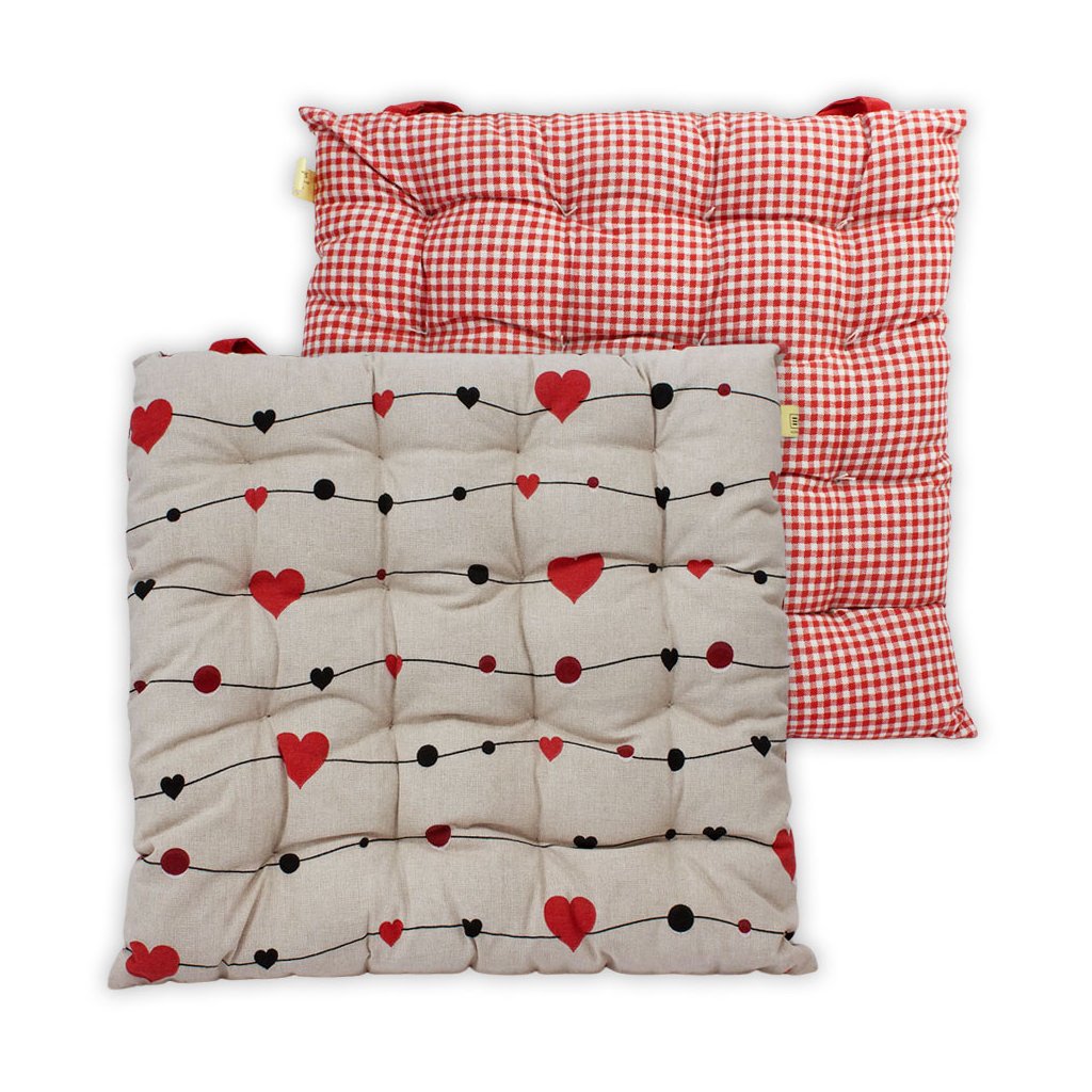 Pekný prešívaný podsedák je určite pohodlnejší a príjemnejší na sedenie. Môžete ho používať na terase, v záhrade alebo doma v jedálni. Motív červených srdiečok na jednej strane sedacieho vankúša pôsobí hrejivo a robí domov domovom.