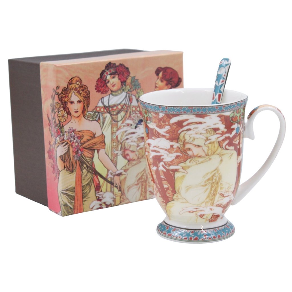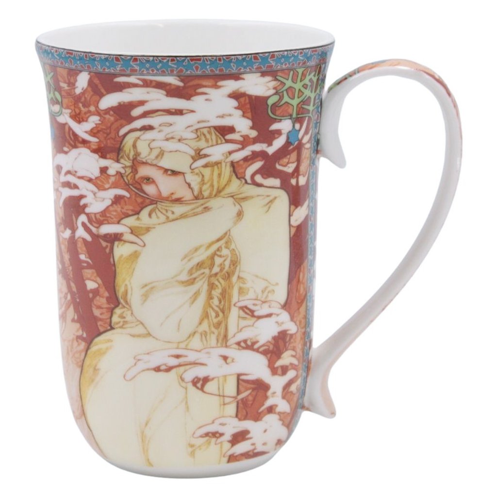 Exkluzívne dielo maliara Alfonsa Muchu na porcelánovom hrnčeku, ktorý je ideálny na čaj, viedenskú kávu alebo dokonca horúcu čokoládu.