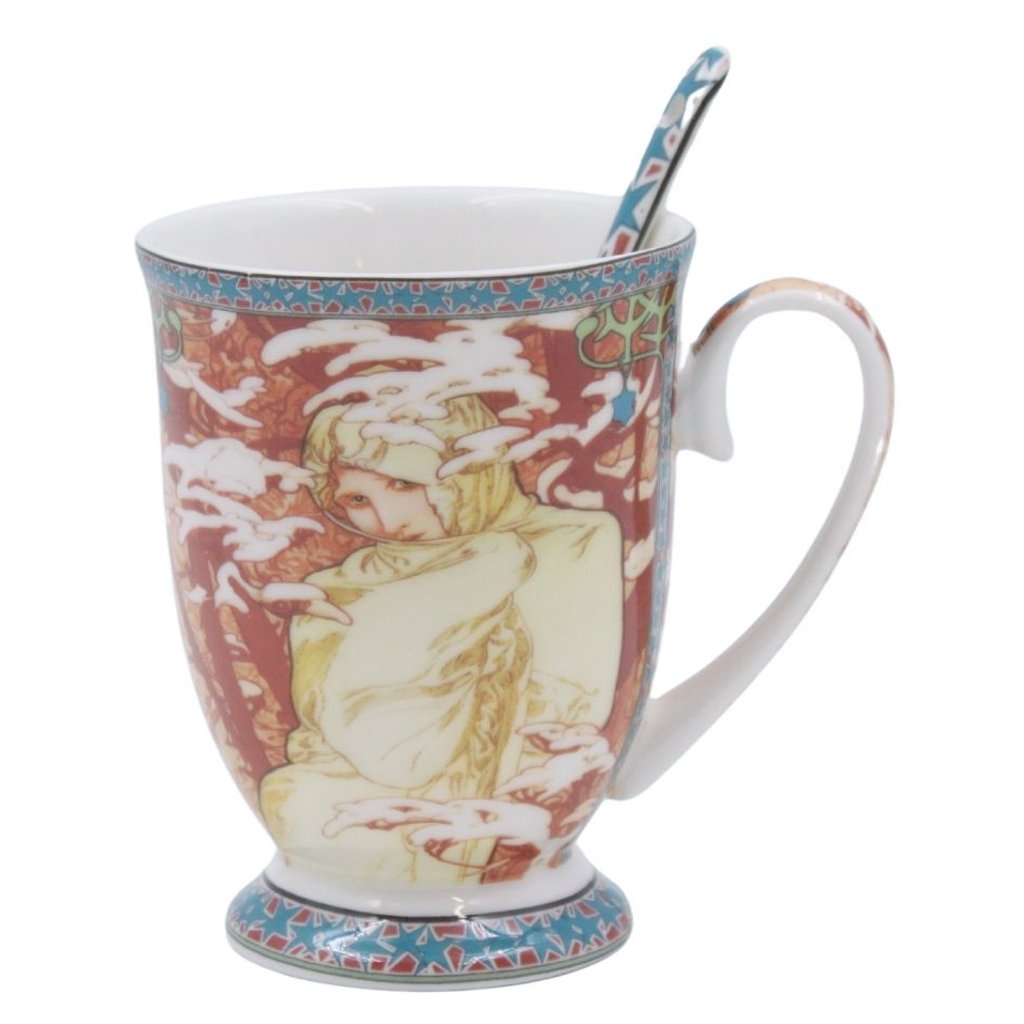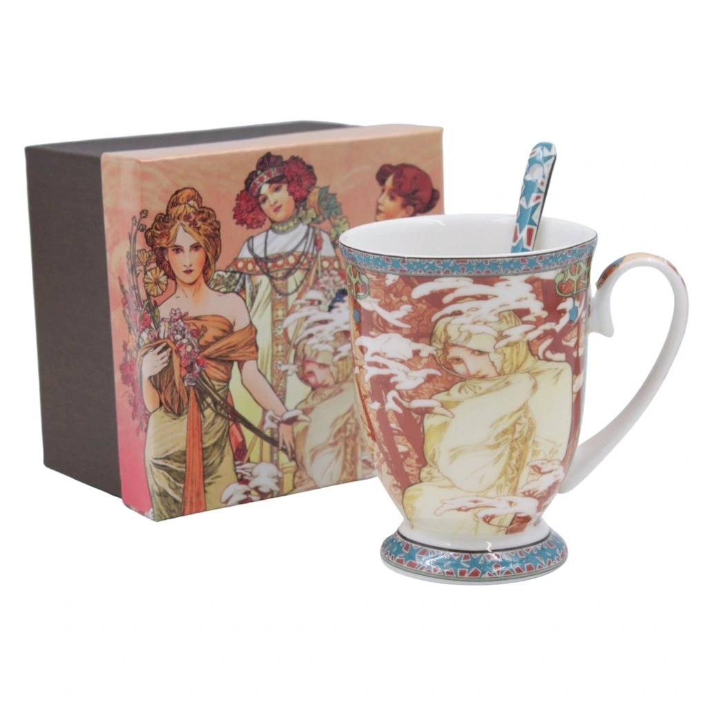 Exkluzívne dielo maliara Alfonsa Muchu na porcelánovom hrnčeku s lyžičkou, ideálne na čaj, viedenskú kávu alebo dokonca horúcu čokoládu.