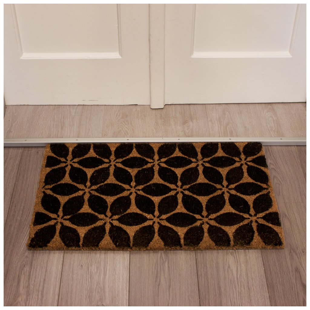 Rohožka s čiernymi kvetmi ozdobí vstupné dvere a ešte pomôže rozlíšiť, kam má návštevník ísť. Kokosové vlákno dokonale čistí obuv a gumová spodná vrstva nedovoľuje, aby sa rohož ľahko kĺzala po podlahe.