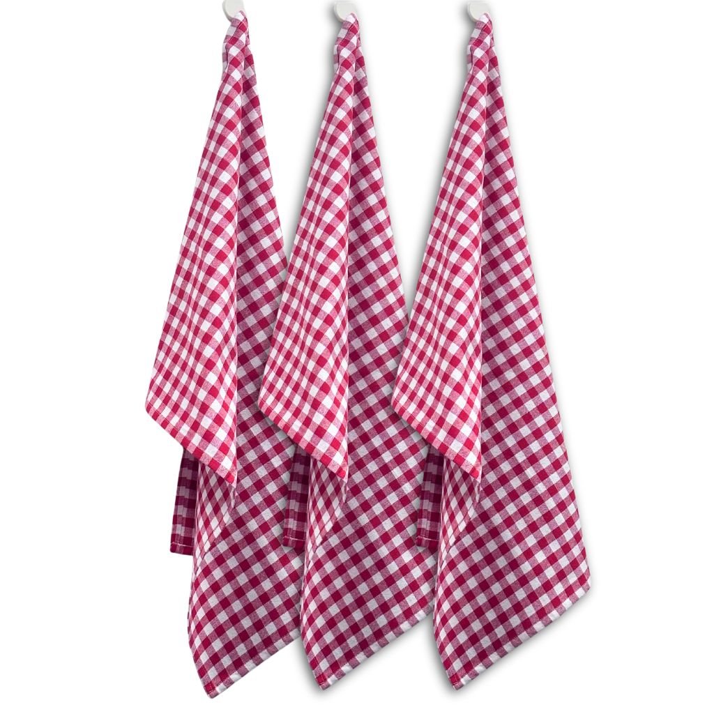 Súprava 3 bavlnených utierok s kockovaným vzorom v červenej farbe. Utierky odporúčame pred prvým použitím vyprať, lepšie plnia svoju absorpčnú funkciu.