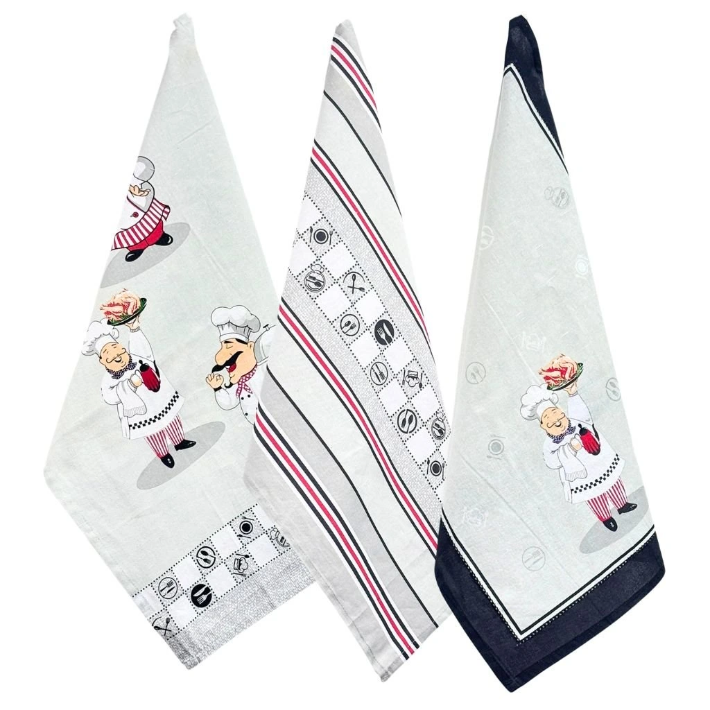 Kuchynská utierka v sade 3 kusov je súčasťou našej kolekcie s motívom šéfkuchára. Ak chcete zladiť kuchyňu, môžete si v našom obchode zaobstarať ďalšie kuchynské textílie s rovnakým motívom a v rovnakých farbách.