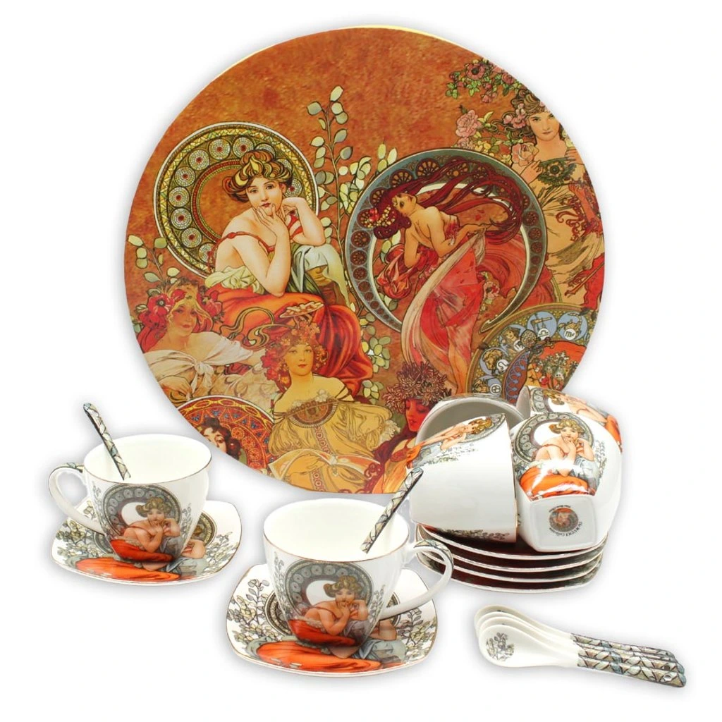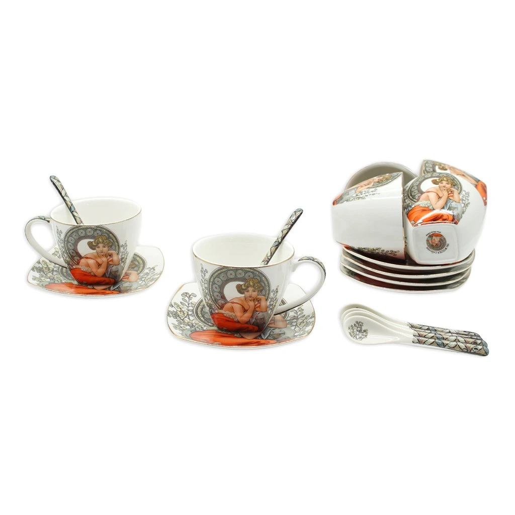 Elegantná súprava z kvalitného tenkého porcelánu s fascinujúcou replikou diela slávneho českého maliara Alfonsa Muchu. Súprava pozostáva zo šiestich porcelánových šálok, podšálok a lyžičiek a je zabalená v darčekovej krabičke.