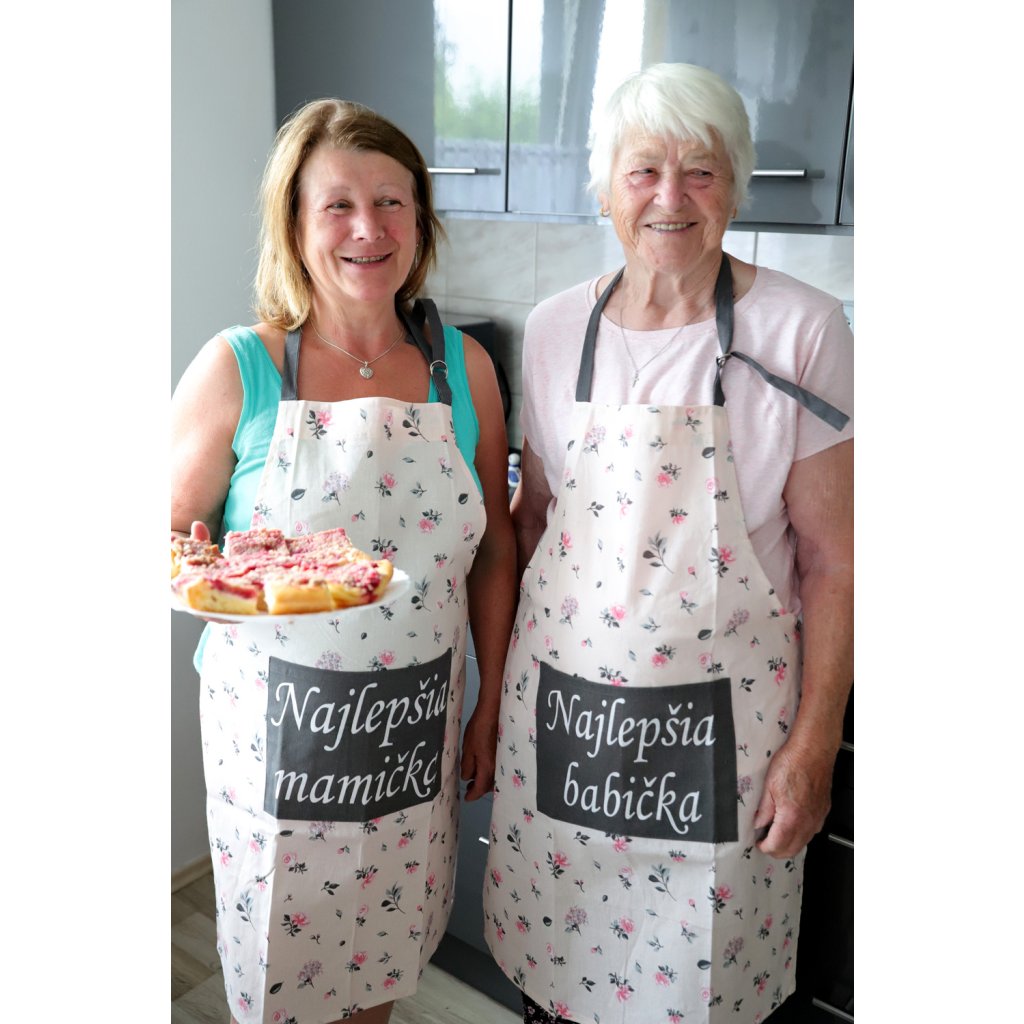 - Kuchynskú zásteru zdobí nápis Najlepšia mamička na tmavom vrecku. Zástera má univerzálnu veľkosť, nastaviteľnú tmavú šnúrku pri krku a zaväzovanie v páse. Veľkosť 60x80 cm.