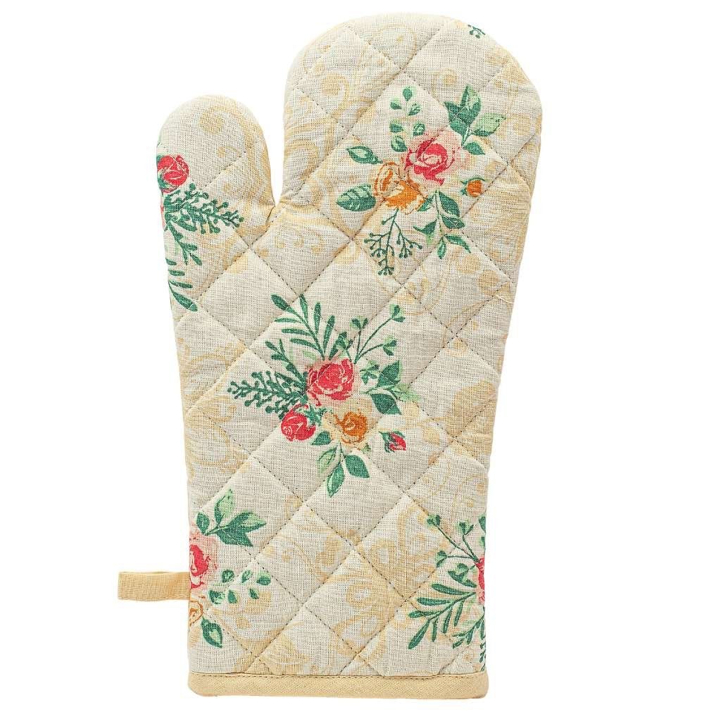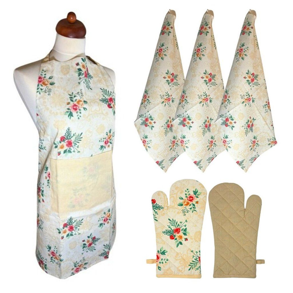 Praktická kuchynská súprava obsahuje najdôležitejšie a nepostrádateľné pomôcky na varenie - slušivú zásteru, chňapku a 3 utierky. Všetko s potlačou kvetov na svetlom pozadí.