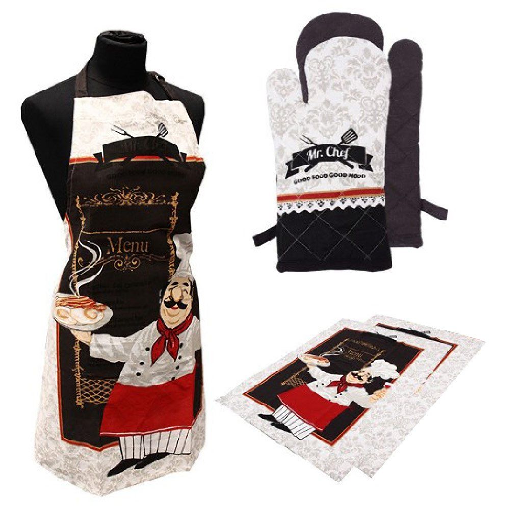 Darujte nadšeným kuchárom a všetkým, ktorí radi varia, praktických textilných pomocníkov do kuchyne. Výhodná súprava obsahuje slušivú zásteru, prešívanú chňapku a 2 kusy utierok. Všetko, čo kuchár potrebuje v kuchyni každý deň. Súprava je zladená v sivej a čiernej farbe s červenou a bielou.