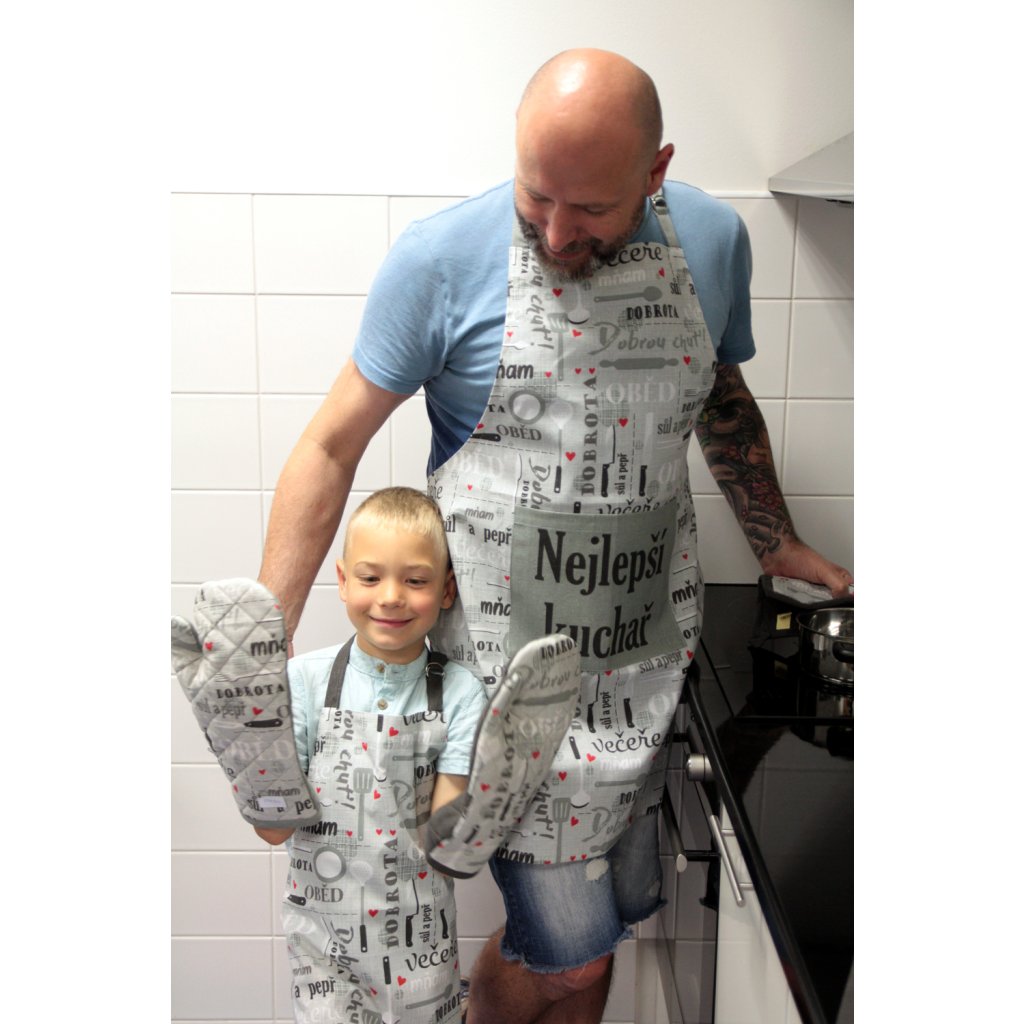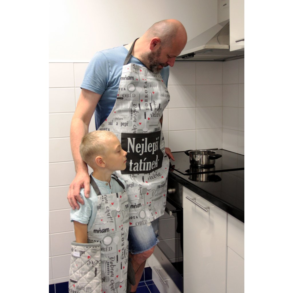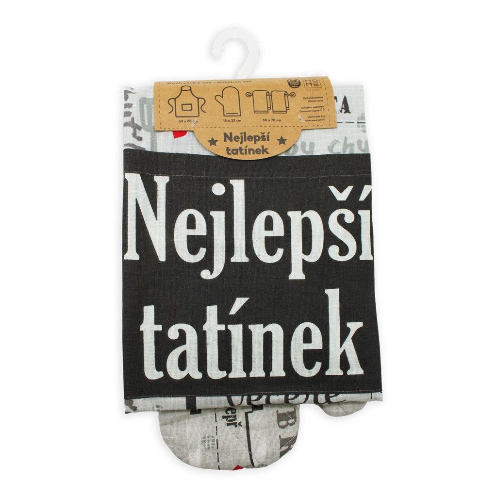 Darujte mu praktických textilných pomocníkov do kuchyne s nápisom Nejlepší tatínek. Výhodná súprava obsahuje slušivú zásteru, prešívanú chňapku a 2 kusy utierok. Všetko je potrebné v kuchyni každý deň alebo možno pri grilovaní. Súprava je zladená do sivých farieb, potlačená kuchynskými motívmi a inšpiratívnymi textami.