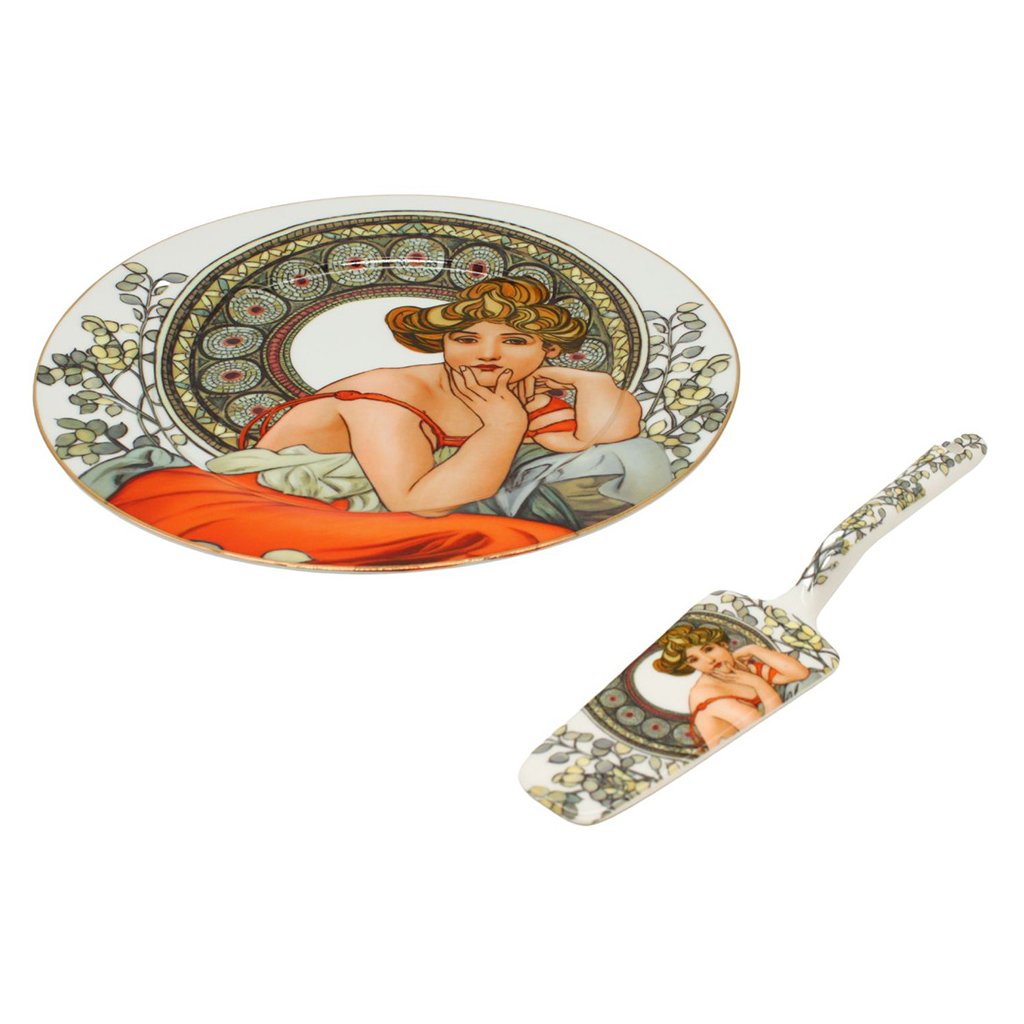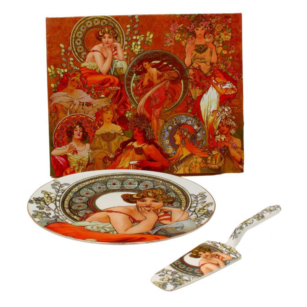Oslava narodenín, svadba alebo dokonca výročie svadby sa nezaobíde bez krásnej torty. Pri týchto vzácnych príležitostiach vám nesmie chýbať tortový tanier s naberačkou. Na štýlovom luxusnom tanieri s dekoráciou z diela českého maliara Alfonsa Muchu bude torta vyzerať skvele uprostred prestretého stola.