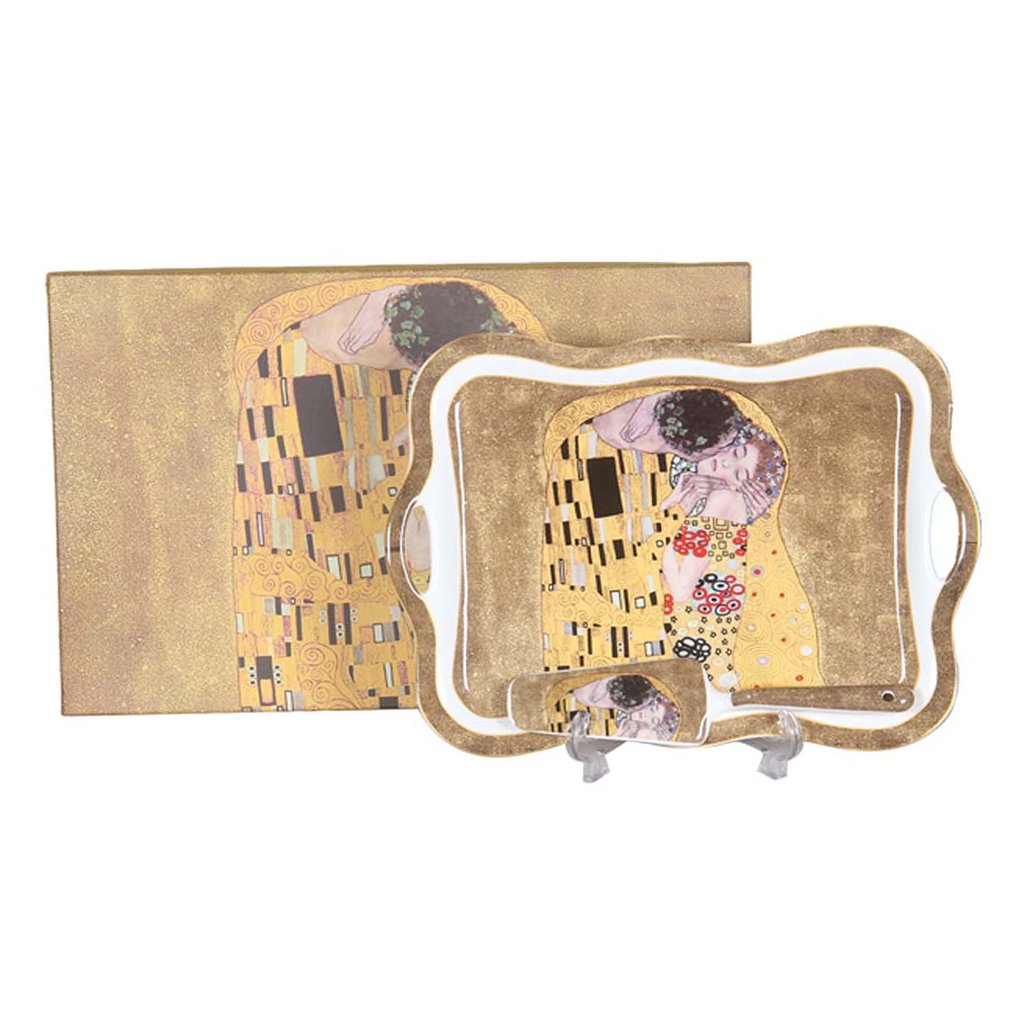 Motív obrazu slávneho maliara Gustava Klimta Bozk zdobí porcelánový servírovací podnos so špachtľou. Krásna výzdoba pre potešenie všetkých, ktorí majú radi jeho dielo. Servírovanie sladkostí, dezertov alebo sendvičov bude luxusné a zároveň jednoduché. Tácka má po stranách úchyty na bezpečné prenášanie.