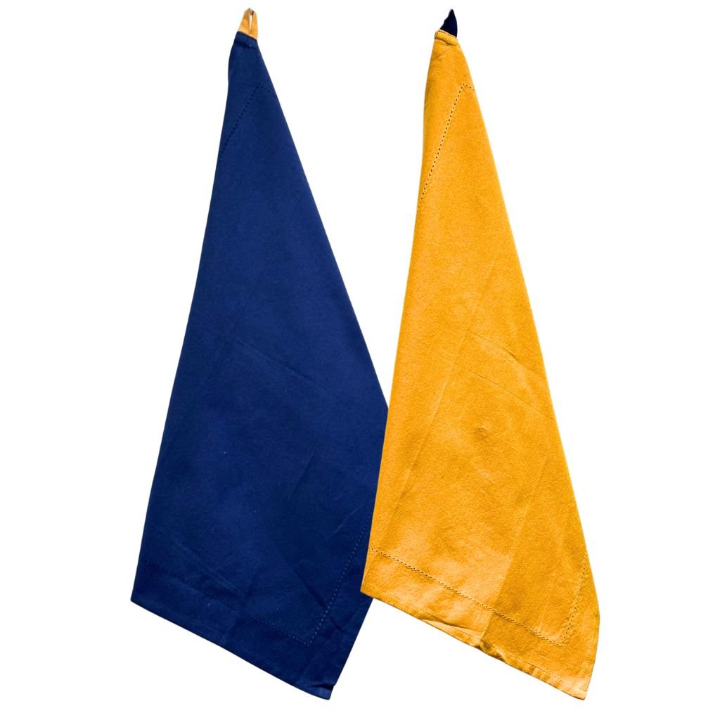 Súprava 2 kuchynských utierok je zladená v modrej a žltej farbe, s pútkami v opačnej farbe utierky a ozdobným štepovaním. Doplňte ich ďalšími výrobkami z kolekcie recyklovanej bavlny - zásterou, chňapkou a vaša kuchyňa získa iný šmrnc.