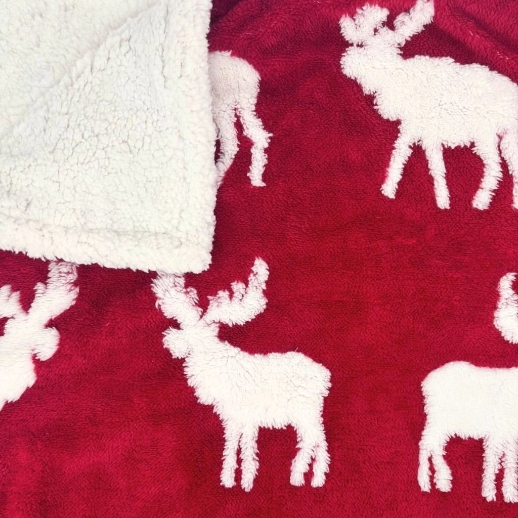 - Teplú mikroflanelovú deku s baránkom. Červená s bielym žakárovým vzorom losa, 50 x 200 cm.