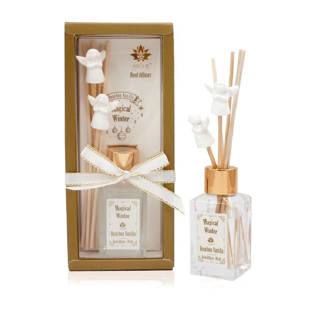 Tyčinkový difuzér s vôňou vanilky (30 ml) – elegantná vôňa do domácnosti, doplnená o dve ílové dekorácie v tvare anjelikov. Zabalený v darčekovej krabičke s vianočným motívom a mašľou.