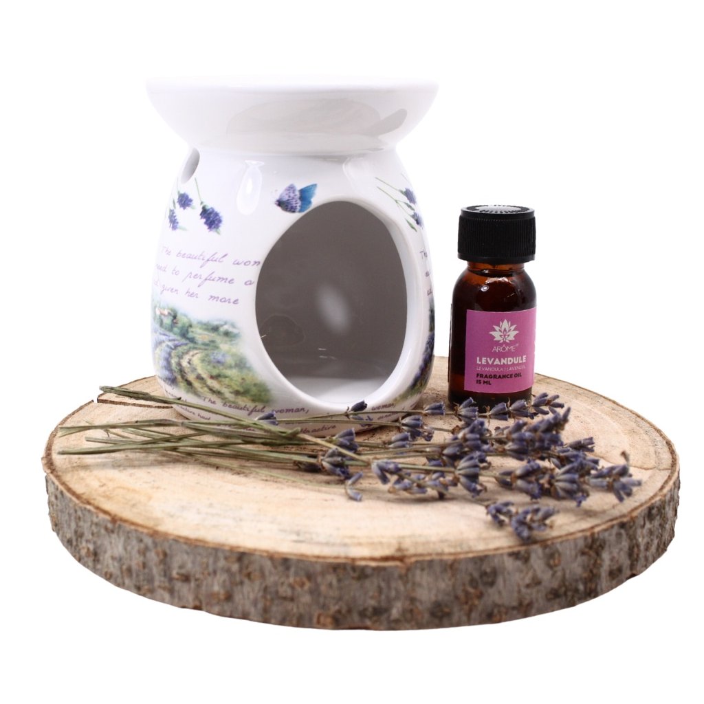 Originálny darček pre milovníkov relaxácie a odpočinku - aromalampa a vonný olej s vôňou levandule.