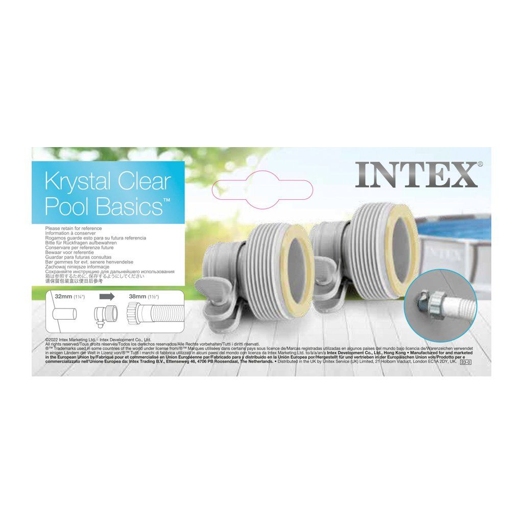 Používa sa aj na pripojenie hadice od pieskovej filtrácie INTEX (38 mm s 2" závitom) k bazénu INTEX s 32 mm závitom.