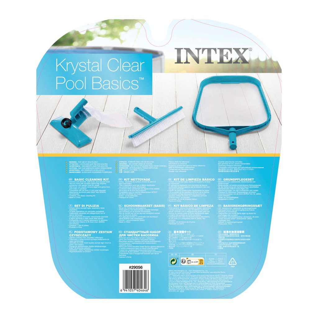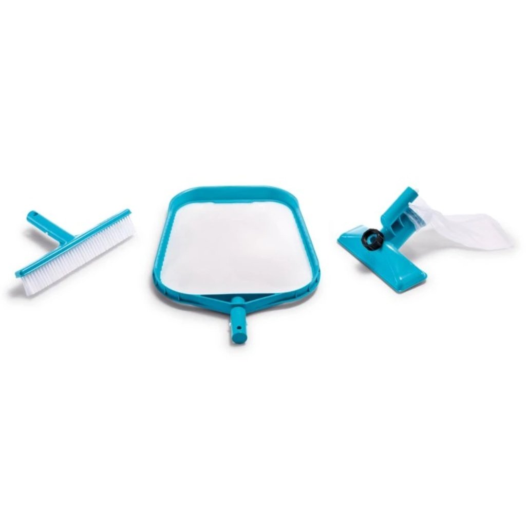Čistiaca súprava INTEX na čistenie nadzemných bazénov vrátane bazénov s nafukovacím golierom. Súprava obsahuje aj ručný vysávač. Čistiaci účinok zabezpečuje prúd vody napojený na hubicu vysávača, pomocou ktorého sa zvieracie nečistoty usadzujú v nylonovom vrecku. Po použití sa vrecko jednoducho opláchne vodou.