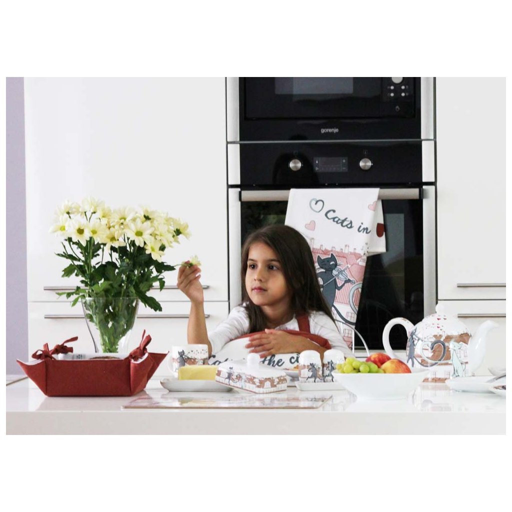 Textilný košík z kolekcia MAČKY V MESTE v kombinácii s ďalšími produktmi s týmto  vzorom dokonale zladí vašu kuchyňu a skrášli váš domov. Využijete na pečivo, orechy, veľkonočné vajíčka alebo sladkosti.