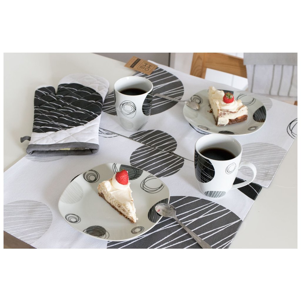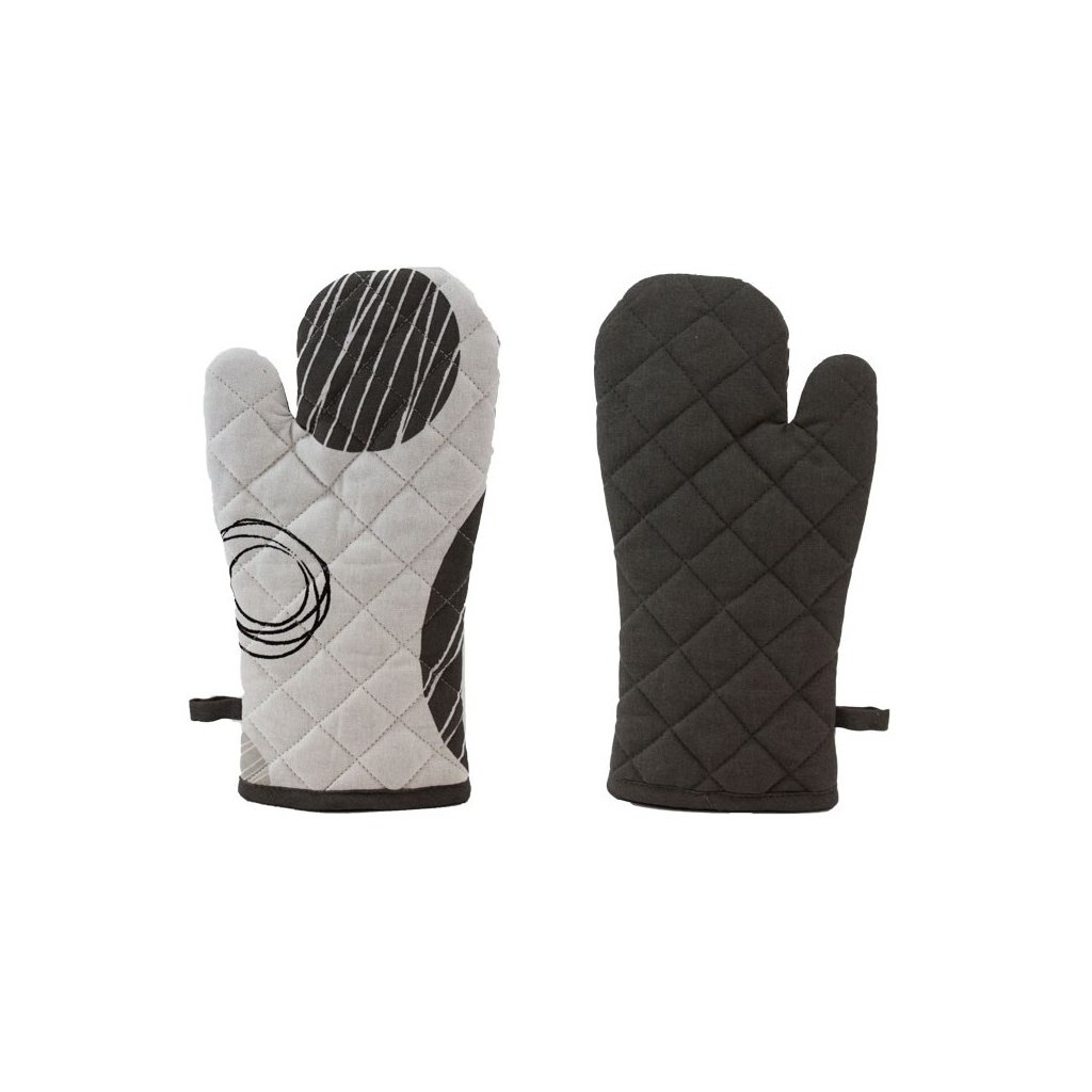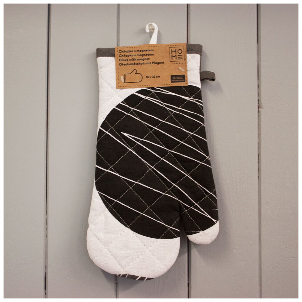Kuchynská chňapka s decentným čiernobielym motívom kruhov.