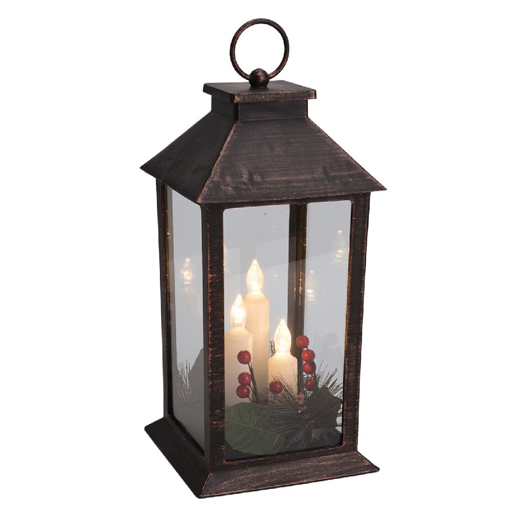 Lucerna má starožitný vzhľad. Nájdete v nej tri elegantné LED sviečky rôznych výšok, doplnené o jasne červené bobule, dekoratívne listy a vetvičku jedle. Ide teda o malú, ale čarovnú vianočnú scénickú dekoráciu.