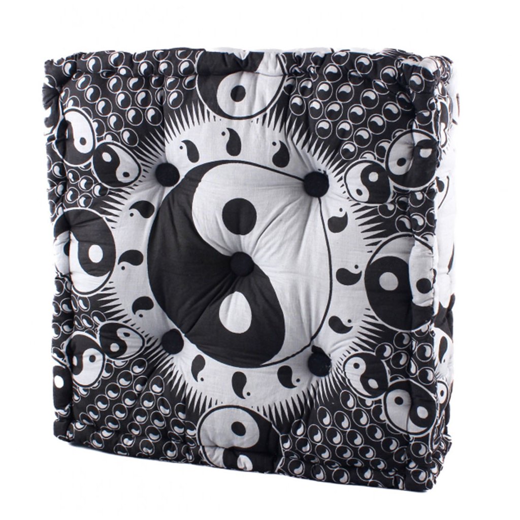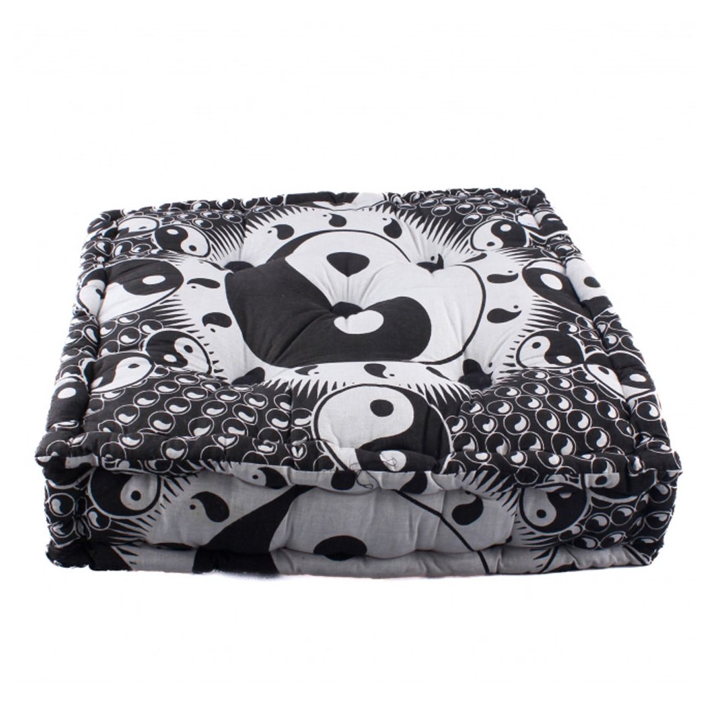 Štvorcová meditačná stolička s čiernobielym vzorom jin a jang.