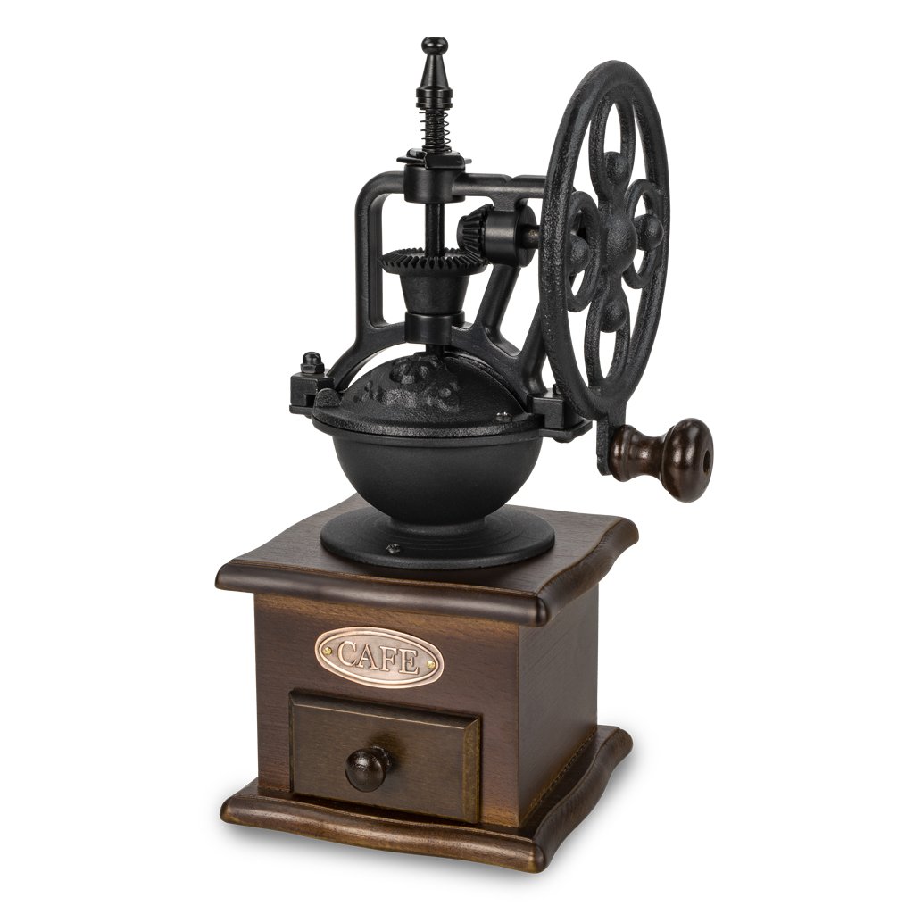 Ručný mlynček na zrnkovú kávu v retro štýle s možným nastavením hrubosti mletia.