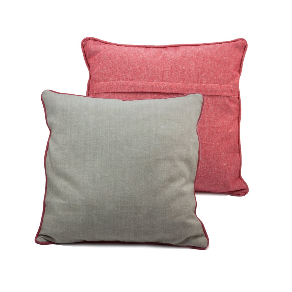 Obliečka na vankúš z recyklovanej bavlny je na jednej strane béžová a na druhej strane červená. Po obvode je zdobená 1,2 cm širokým okrajom. Zapína sa na zips, ktorý je skrytý pod červenou stranou.