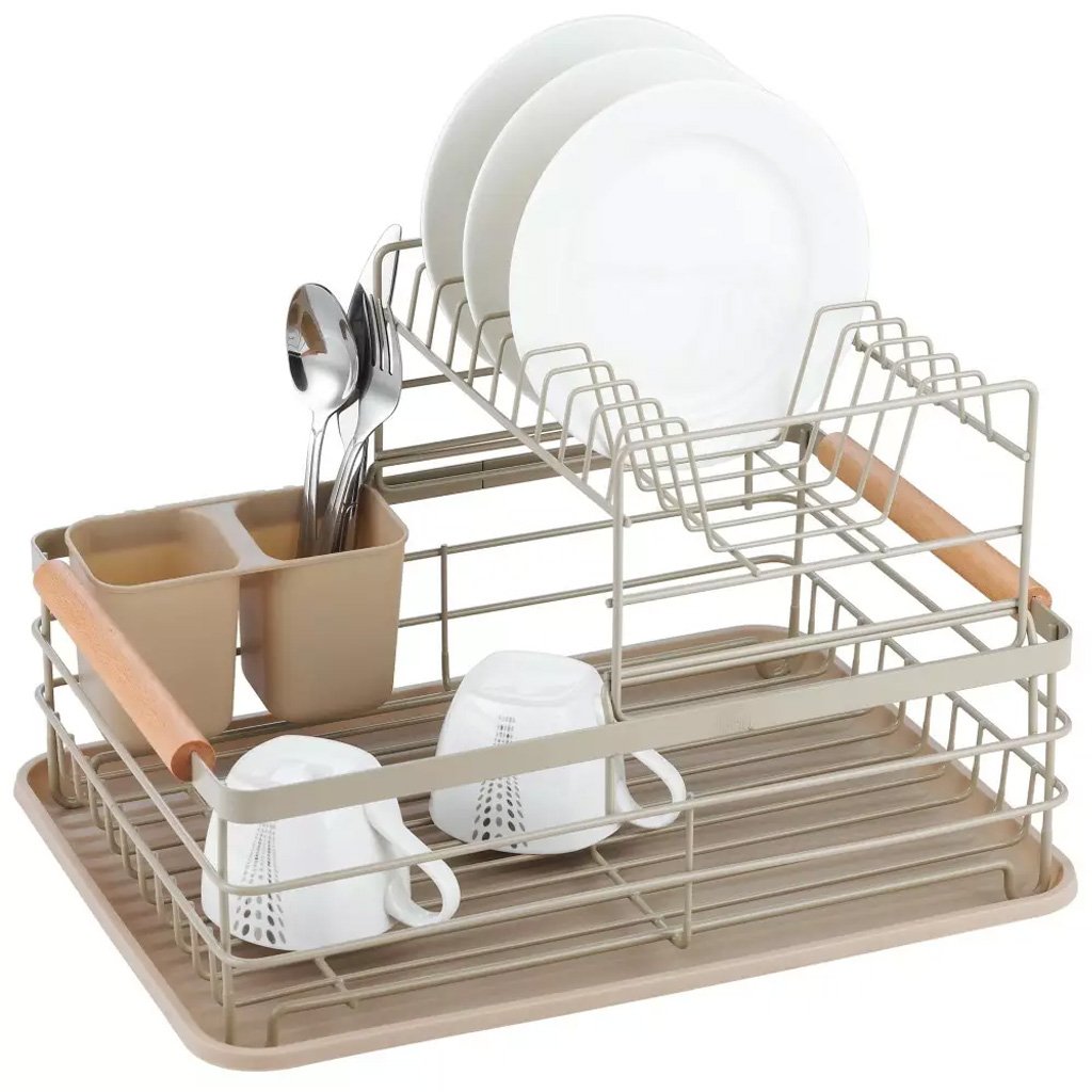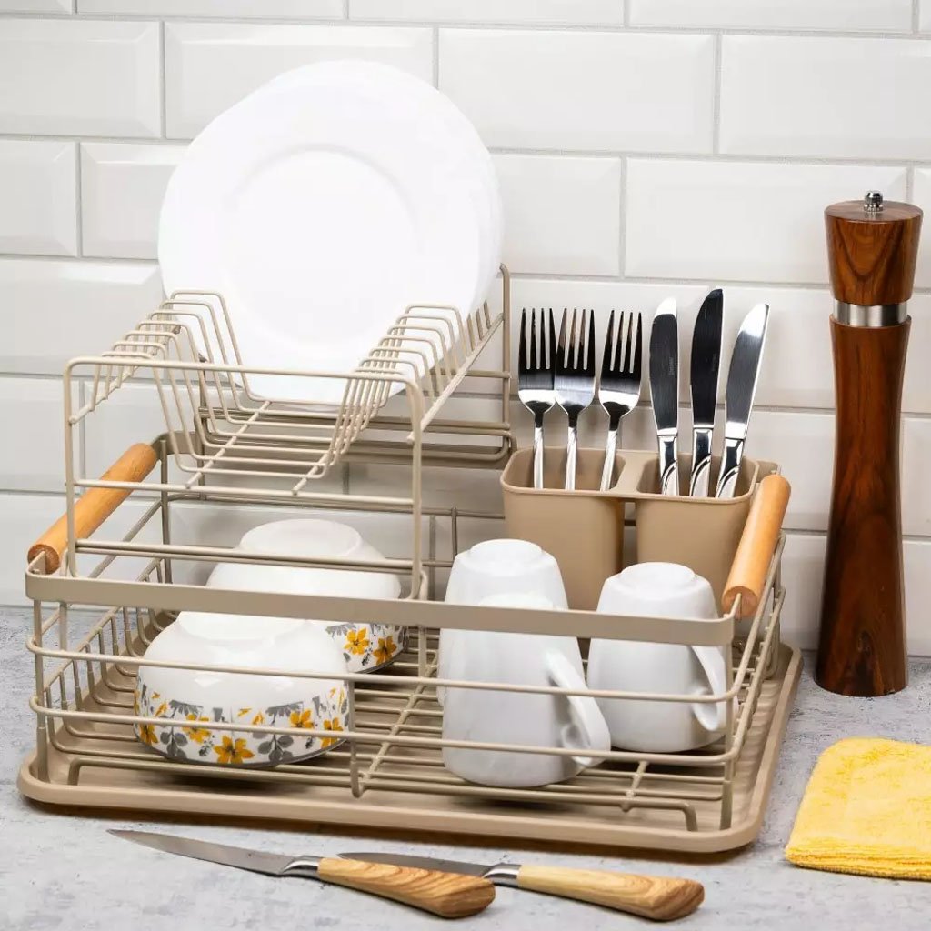 Sušiak na riad možno použiť vo veľkých aj malých kuchyniach. Vďaka svojej univerzálnej farbe vyzerá dobre v každom interiéri. Sušiak na riad je vybavený aj praktickým držiakom na riad. Rozdelenie na 2 priehradky umožňuje jednoduché triedenie lyžičiek, vidličiek a nožov, čo pomáha udržiavať poriadok v kuchyni. Dvojúrovňový stojan na sušenie riadu je stabilný, čo zaručuje bezpečnosť počas používania.