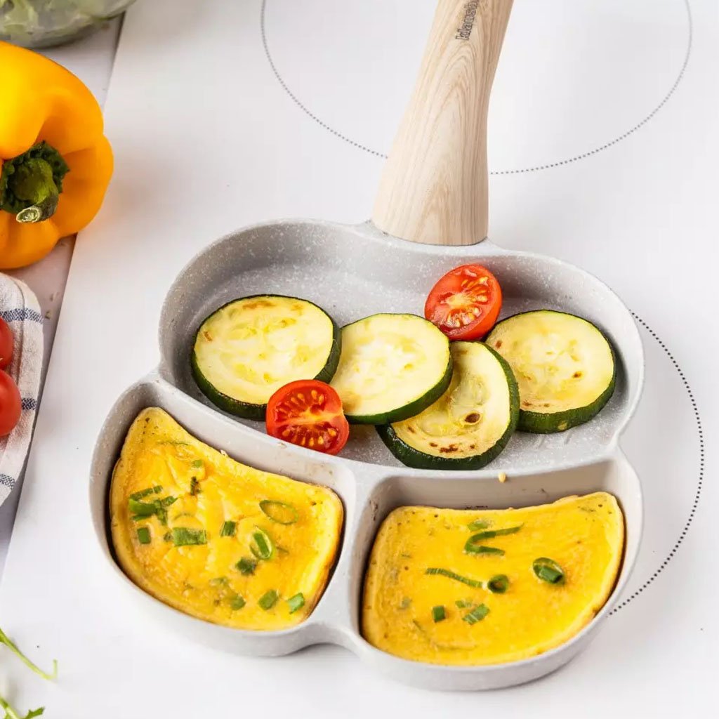 Panvica Klausberg ponúka praktické rozloženie varného priestoru – dve okrúhle formy sú ideálne na prípravu volských ôk, menších palaciniek alebo mini lievancov. Tretia, podlhovastá sekcia je navrhnutá na smaženie slaniny, zeleniny, klobás, hamburgerov či ďalších doplnkov raňajok. Oddelené zóny umožňujú pripravovať viac rôznych surovín naraz, bez vzájomného miešania chutí a vôní.