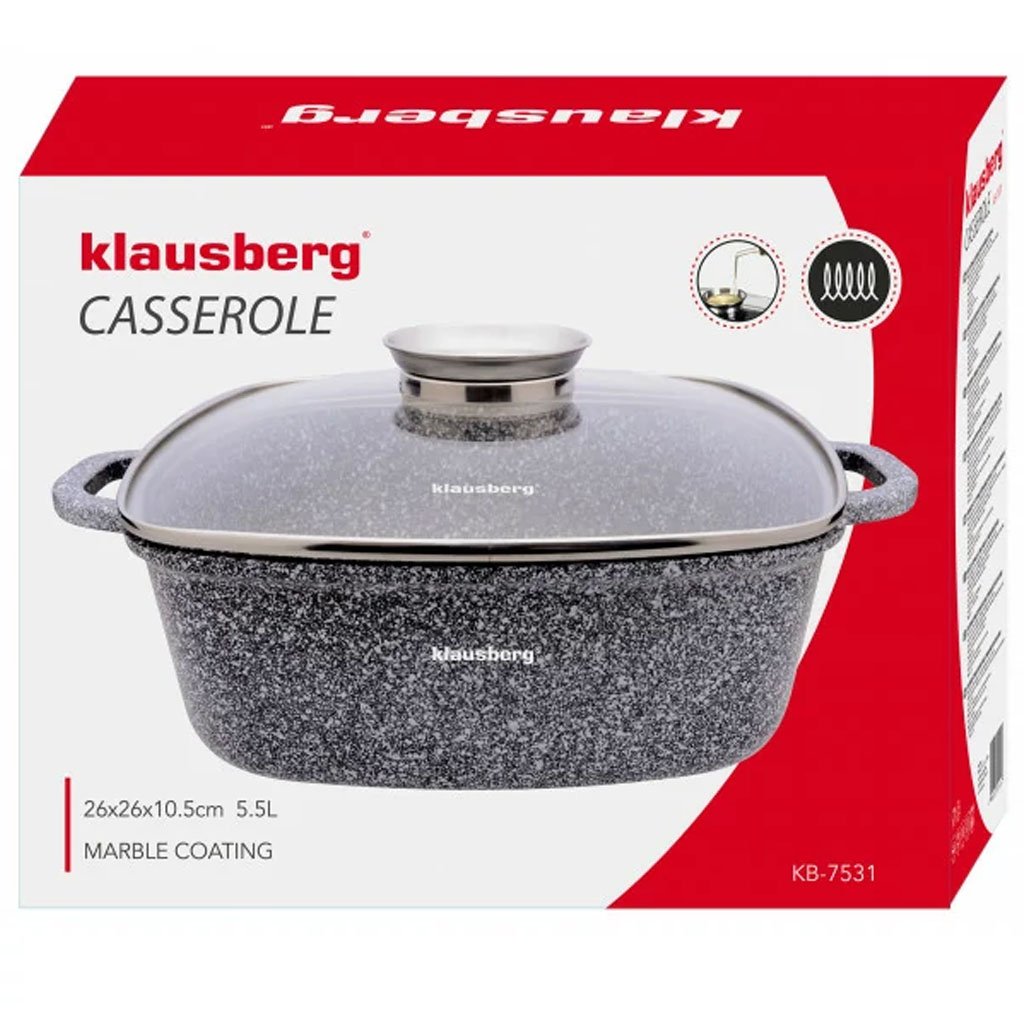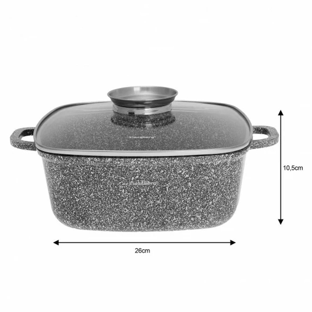Pekáč Klausberg je ideálnou voľbou na každodenné varenie a pečenie. Vďaka svojmu štvorcovému tvaru a objemu 5,5 litra ponúka dostatok priestoru na prípravu rôznych pokrmov. Nepriľnavý mramorový povrch umožňuje varenie s minimálnym množstvom tuku a jednoduché čistenie. Pekáč je vhodný na všetky typy varných dosiek vrátane indukcie a do rúry pri teplotách okolo 200 °C.