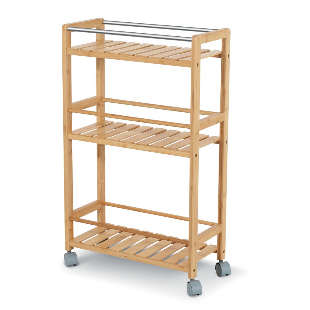 Bambusový vozík s tromi policami, sivými plastovými kolieskami a kovovými úchytmi. Funkčný dizajn a prírodná farba bambusu sa všestranne prispôsobia každej miestnosti v domácnosti – v kúpeľni, kuchyni aj obývačke. Vozík umožňuje praktické uloženie vecí a zároveň ich budete mať vždy poruke. Vďaka štyrom otočným kolieskam je veľmi praktický a jednoducho sa presúva. Maximálna nosnosť vozíka je 15 kg.