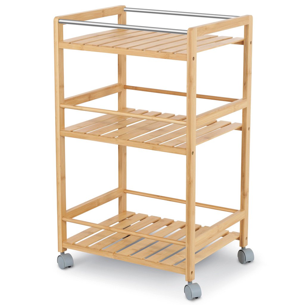 Bambusový vozík s tromi policami, sivými plastovými kolieskami a kovovými úchytmi. Funkčný dizajn a prírodná farba bambusu sa všestranne prispôsobia každej miestnosti v domácnosti – v kúpeľni, kuchyni aj obývačke. Vozík poskytuje praktický úložný priestor a umožňuje mať všetky veci vždy poruke. Vďaka štyrom otočným kolieskam je veľmi praktický a jednoducho sa presúva. Maximálna nosnosť vozíka je 15 kg.