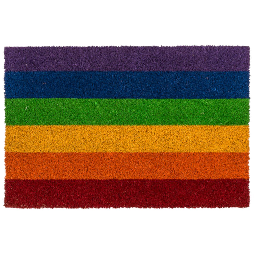 Rohožka Pride vyrobená z kokosového vlákna v dúhových farbách.