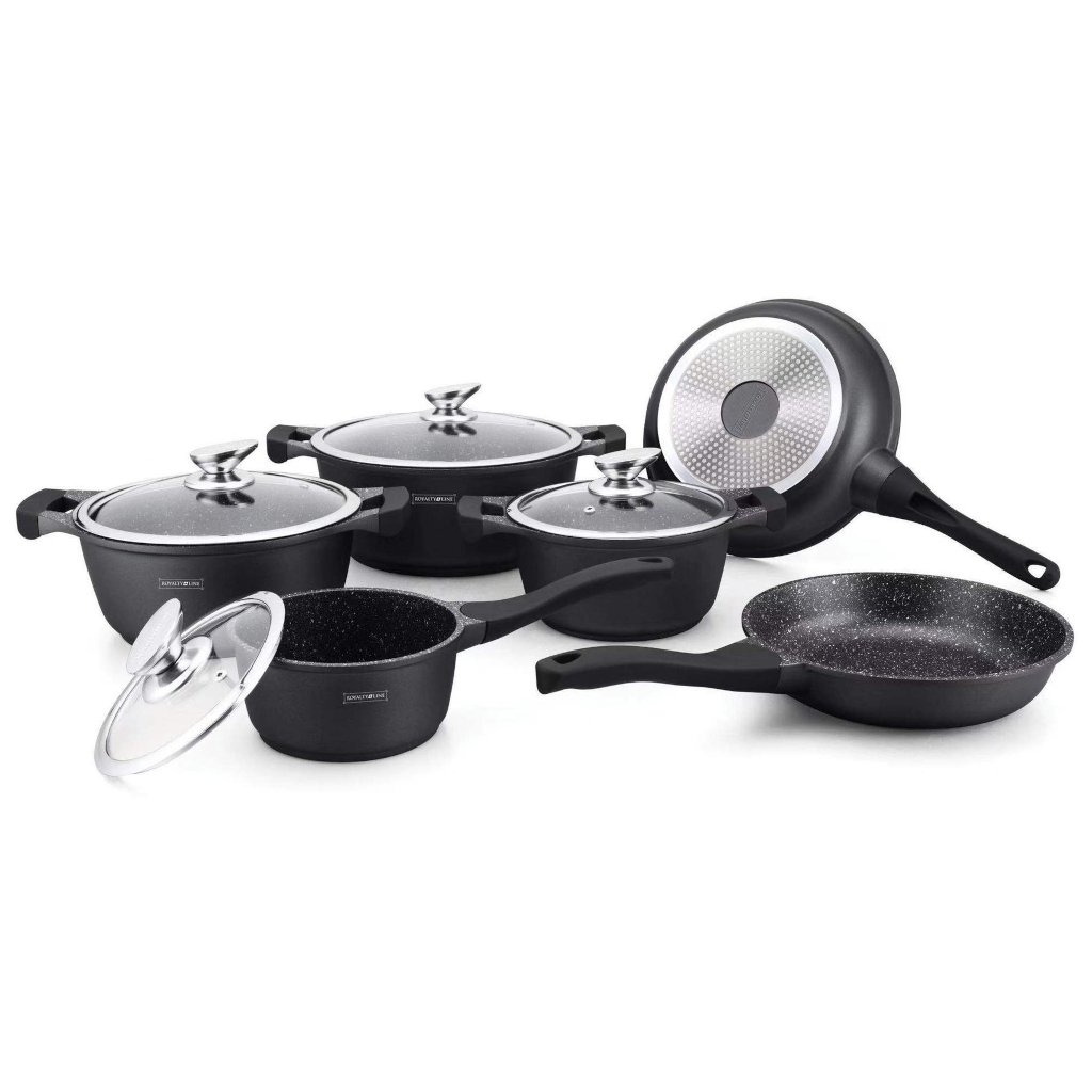 Súprava kuchynského riadu ROYALTY je vyrobená z liateho hliníka. Kuchynský riad ROYALTY má vysoko kvalitné prevedenie hrncov s antibakteriálnym nepriľnavým mramorovým povrchom, ktorý zaručuje zdravé varenie. Vďaka nepriľnavému povrchu môžete pripravovať zdravé a diétne jedlá len s minimom tuku. Zosilnené dno umožňuje rovnomerné rozloženie tepla a vďaka vynikajúcej tepelnej vodivosti sa teplo rozvádza aj rýchlejšie. Riad je vhodný na indukčné varné dosky.