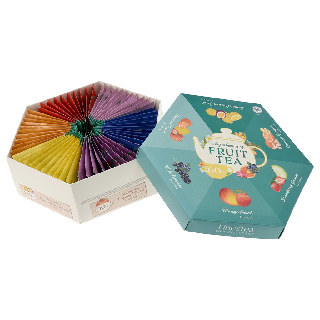Táto darčeková sada čiernych čajov s ovocnou príchuťou ponúka pestrý výber 60 jednotlivo balených vrecúšok, uložených v elegantnej šesťhrannej krabičke. Každá príchuť predstavuje sviežu kombináciu kvalitného čierneho čaju a výrazných ovocných tónov, ktoré potešia milovníkov aromatických nápojov. Výborne sa hodí ako darček pre priateľov, rodinu aj kolegov.