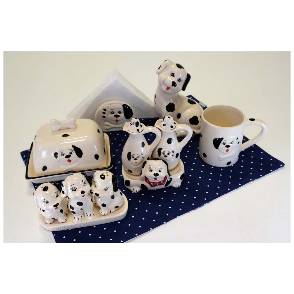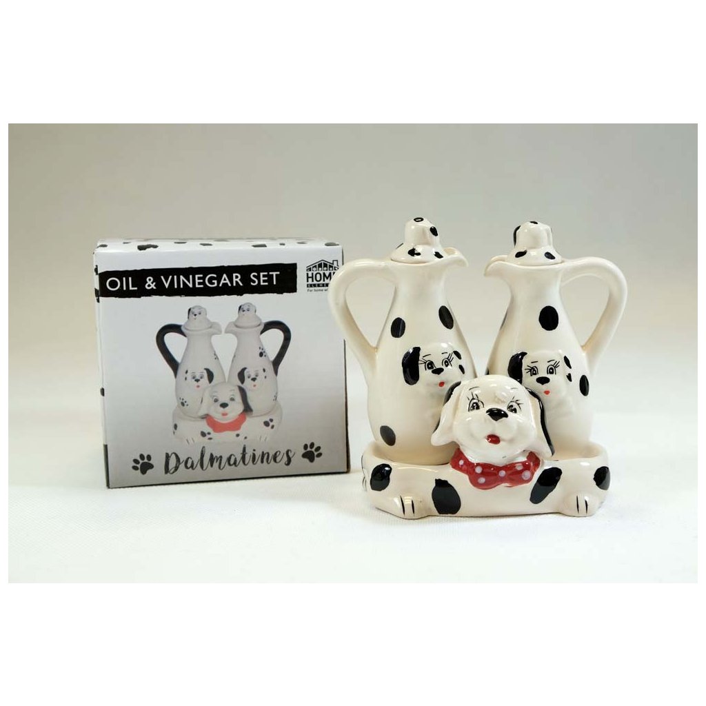 Set k dochutení vašich obľúbených pokrmov obsahuje nádobku na ocot, nádobku na olej a ozdobný podtácok. Motív veselých dalmatíncov Vám iste behom stolovaní zdvihne náladu.