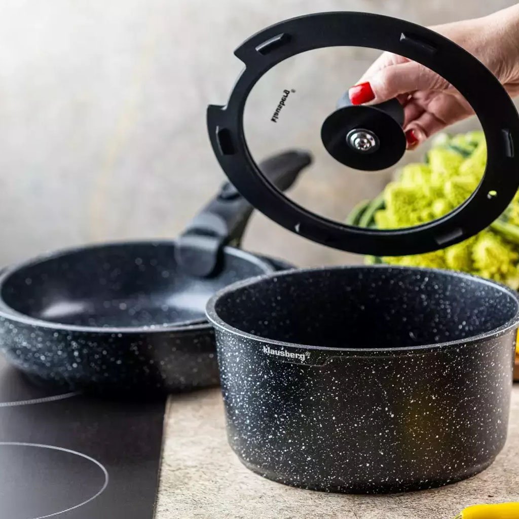Moderná súprava riadu s nepriľnavým mramorovým povrchom – zdravé varenie bez zbytočného tuku.