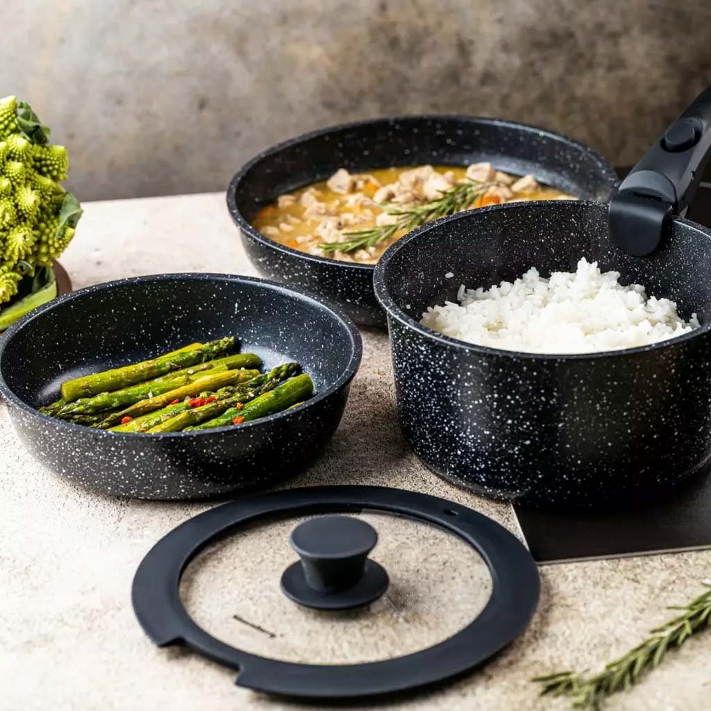 Elegantná a praktická súprava hrnca a panvíc s odnímateľnou rukoväťou je ideálnou voľbou do každej modernej kuchyne. Mramorový povrch zabezpečuje rovnomerné rozloženie tepla a zdravé varenie bez pripaľovania. Vhodná je aj na uchovávanie pokrmov v chladničke alebo na zapekanie v rúre.