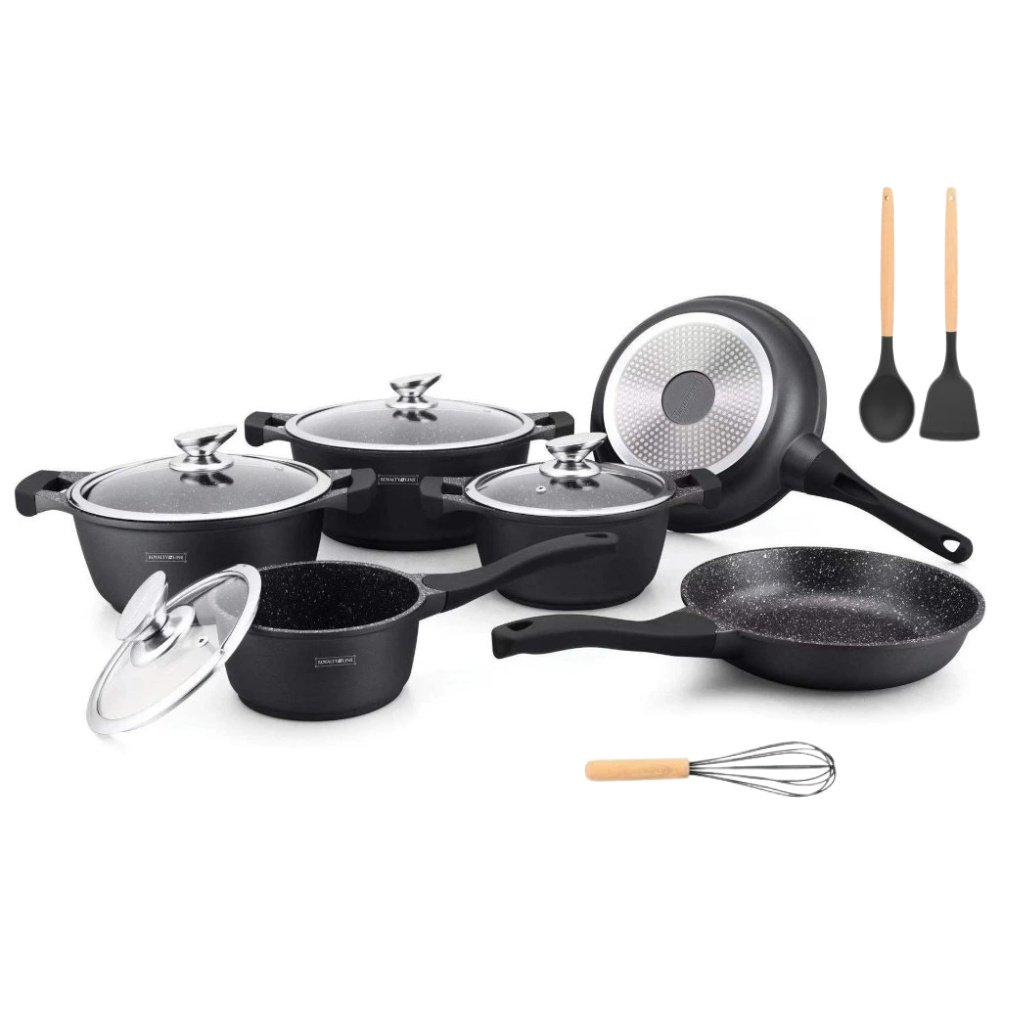 Súprava kuchynského riadu ROYALTY obsahuje riad v elegantnej čiernej farbe. Nájdete v nej tri hrnce a rajnček s pokrievkami a dve panvice. Hrnce majú rozmery vhodné na prípravu najčastejšie pripravovaných pokrmov.
