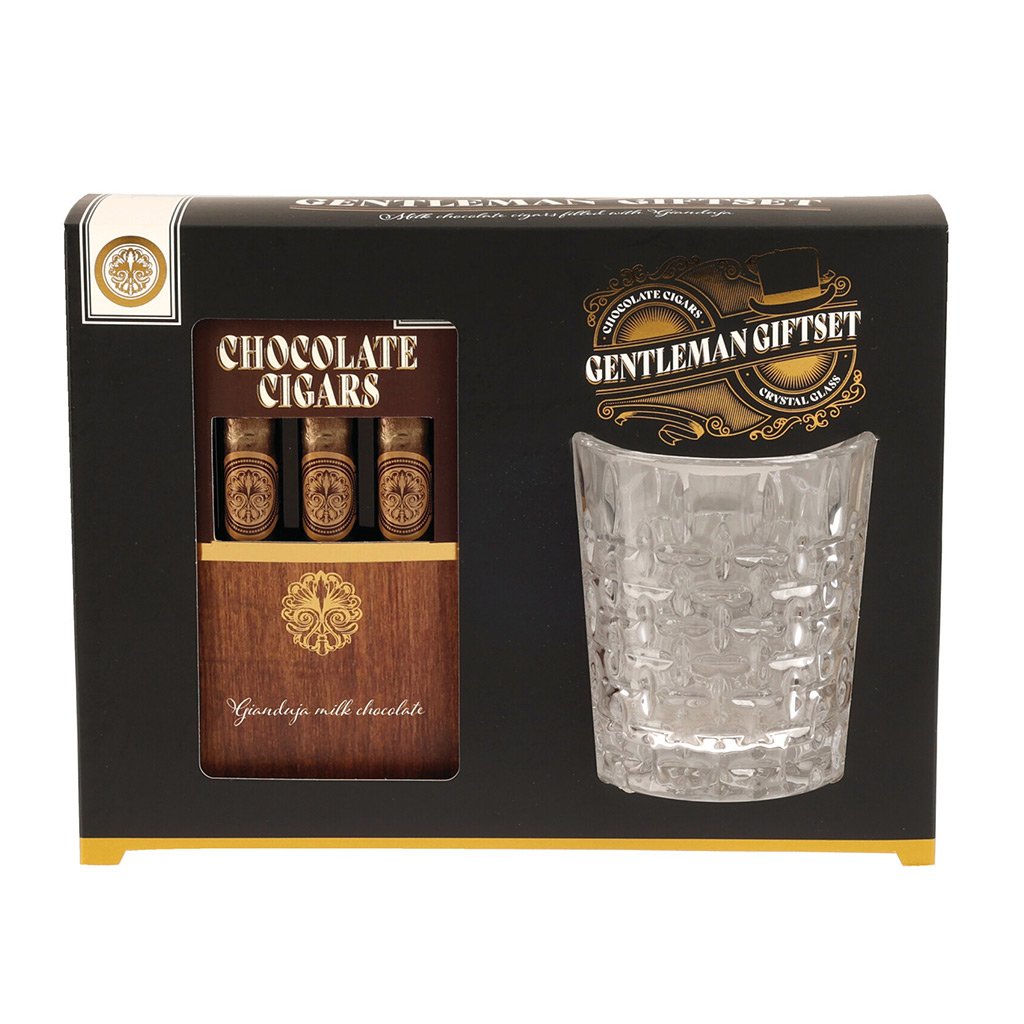 sada obsahuje pohár na whisky a 3 čokoládové cigary