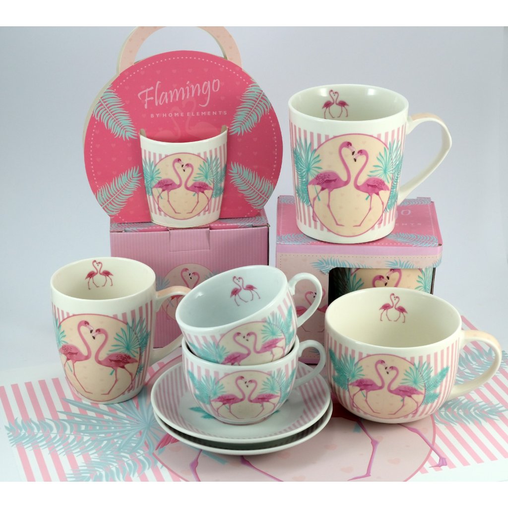 Čajová súprava s Plameniakmi sa skladá z dvoch čajových šálok (250 ml) s podšálkami.