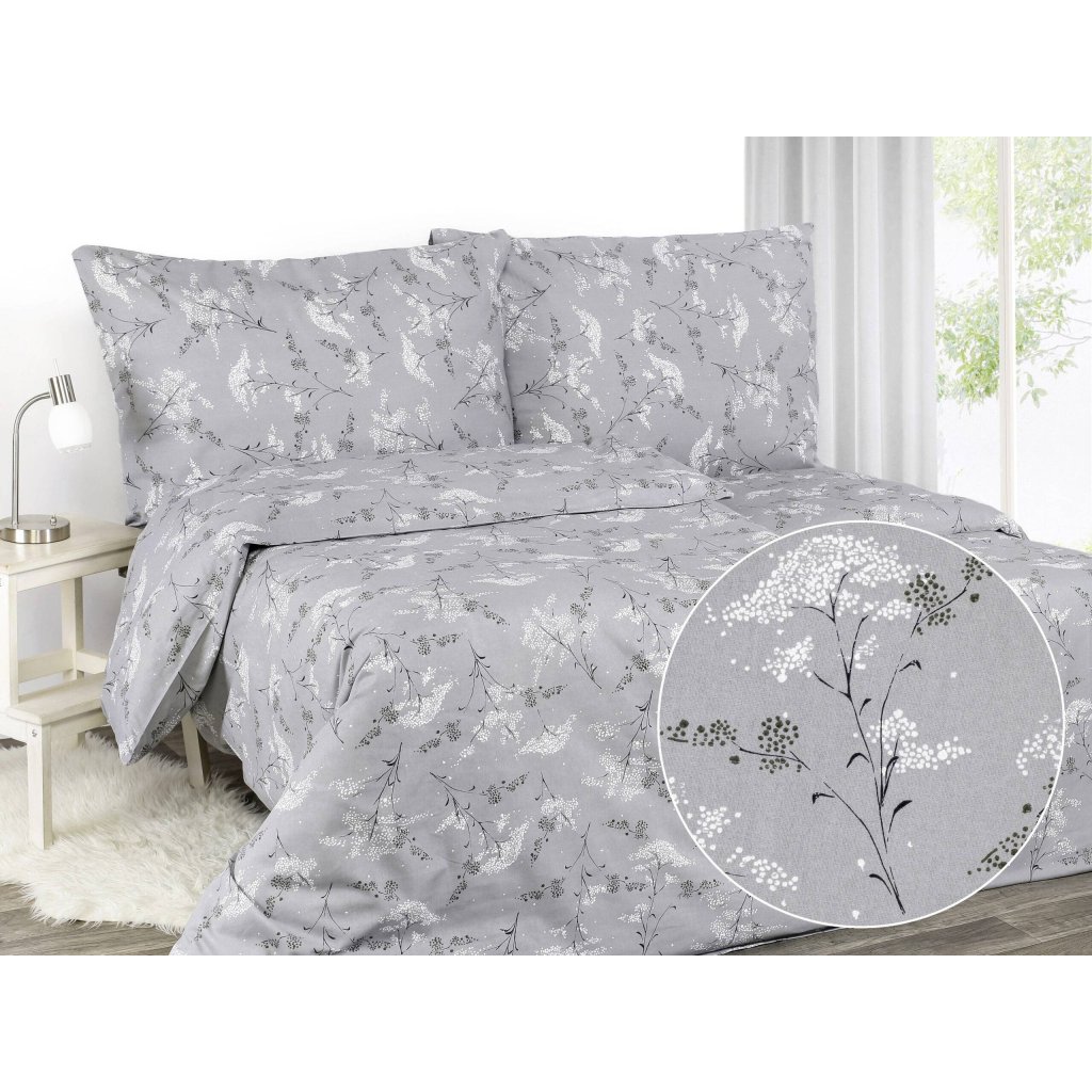 Vneste do svojej spálne jemnú eleganciu a pokoj pomocou sivou posteľnou bielizňou zdobenou bielym motívom kvetov. Táto posteľná bielizeň z bavlneného saténu ponúka mäkkosť, hebkosť na dotyk a maximálne pohodlie, ktoré vám spríjemní každú noc. Jemný kvetinový vzor na sivom podklade prináša do miestnosti harmóniu a príjemnú atmosféru.