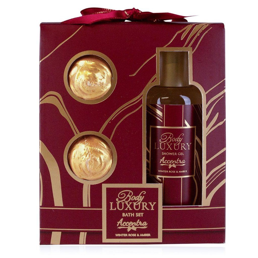 Luxusná kozmetická súprava Body Luxury so sprchovacím gélom a 2 kusmi šumivých bômb do kúpeľa pre ten najlepší relaxačný kúpeľ. Vôňa sladkého, živicového a teplého jantáru v kombinácii so sviežou, jemnou a mierne chladivou kvetinovou vôňou navodzuje pocit hrejivej elegancie s jemným sviežim nádychom.