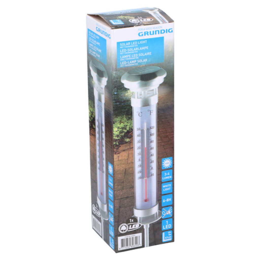 Solárne svetlo Grundig s teplomerom. Celková výška 570 mm, Ø125 mm. Jednoduchá inštalácia - zapichnite svetlo do zeme