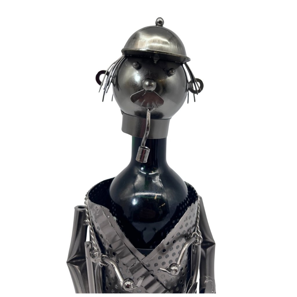 Kovový stojan na jednu fľašu vína v tvare stojaceho poľovníka. Výška 29 cm.
