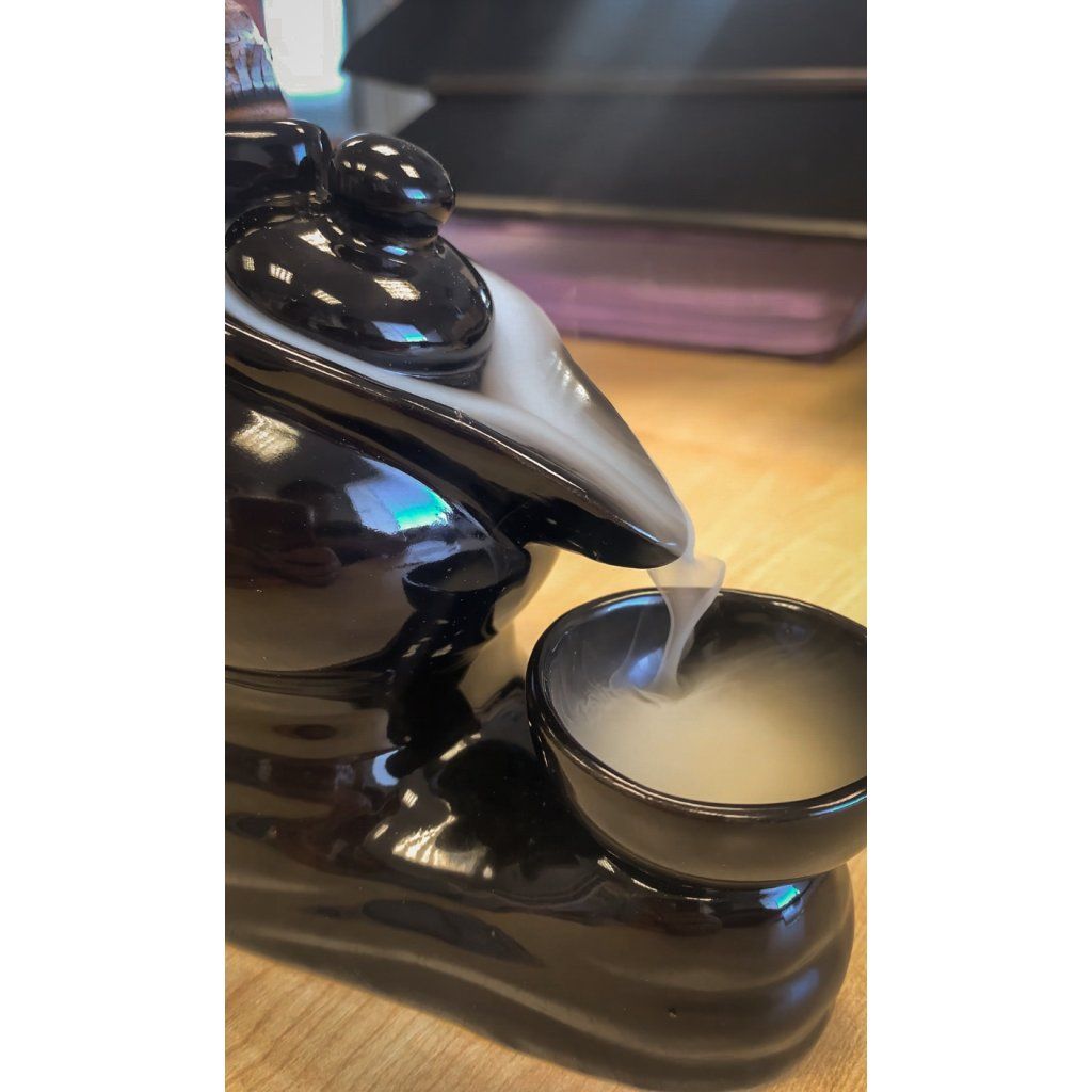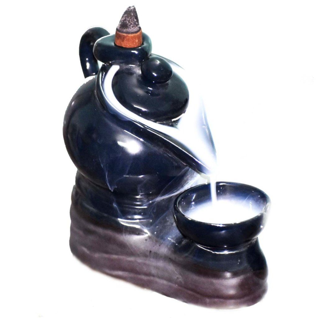 Originálny stojan na vonné kužele funguje ako fontána na prúdiaci dym. Keramický stojan je navrhnutý v tvare čajníka a šálky. Horiaci kužeľ produkuje dym, ktorý je ťažší ako vzduch. Dym prechádza otvorom a vytvára nádherný parný vodopád, ktorý sa cez kanvicu dostáva do šálky.
