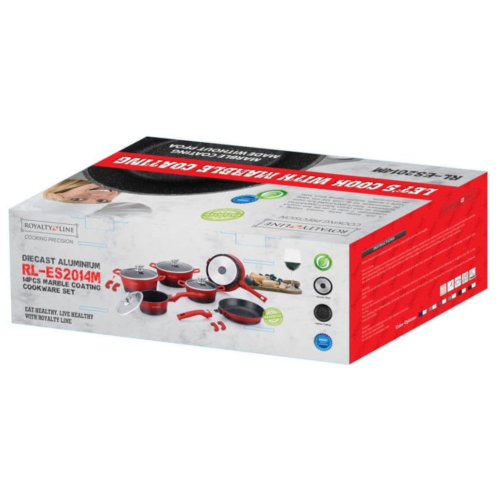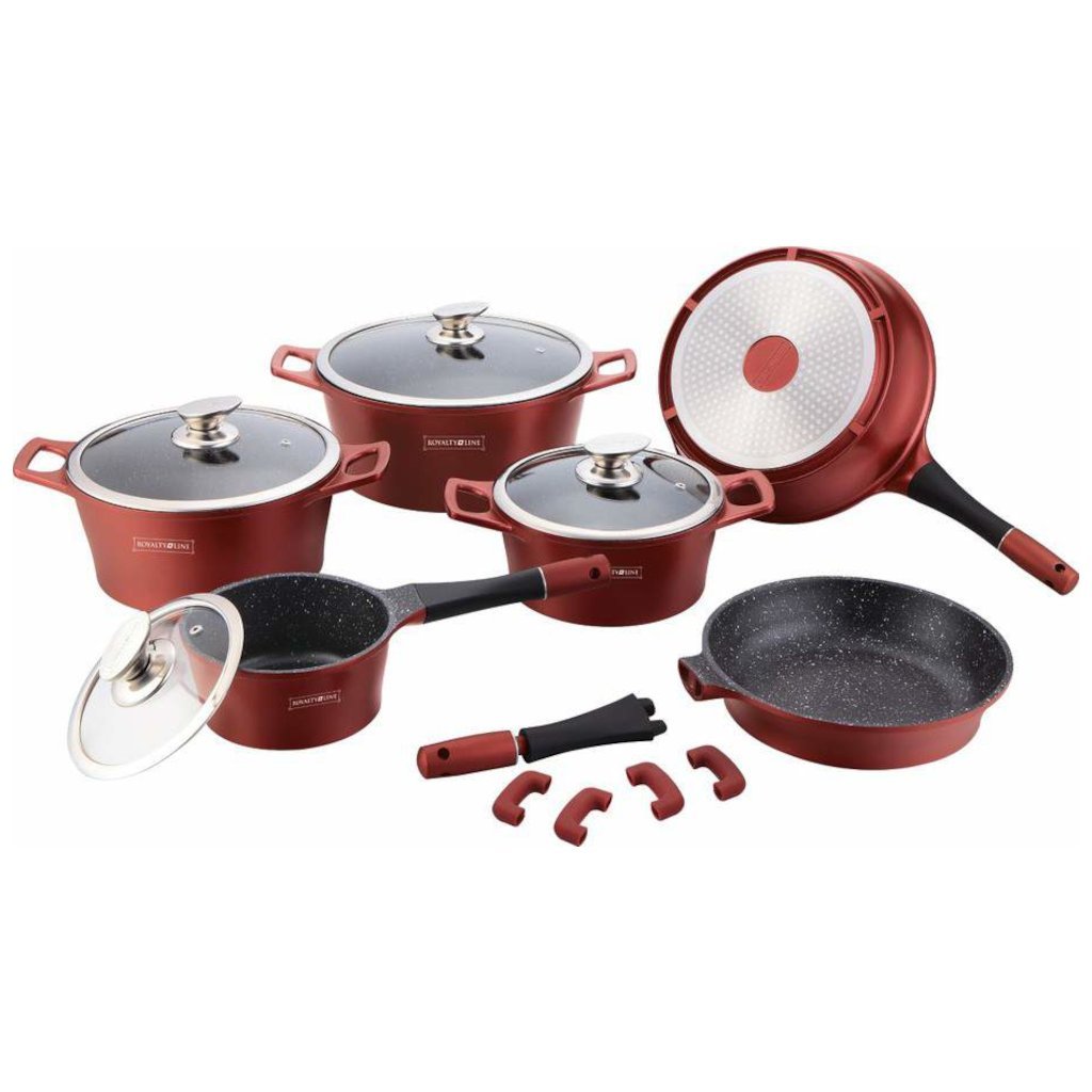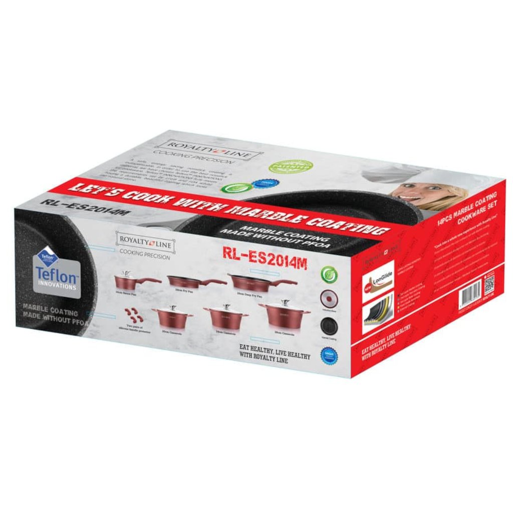 Súprava kuchynského riadu ROYALTY je vyrobená z liateho hliníka. Nájdete v nej všetko, čo potrebujete na pohodlné varenie. Tri hrnce a rendlík s pokrievkami, dve panvice. Kuchynský riad ROYALTY sa vyznačuje kvalitným dizajnom hrncov s antibakteriálnym nepriľnavým mramorovým povrchom, ktorý zaručuje zdravé varenie. Vďaka nepriľnavému povrchu môžete pripravovať zdravé a diétne jedlá len s minimom tuku. Zosilnené dno umožňuje rovnomerné rozloženie tepla a vďaka vynikajúcej tepelnej vodivosti sa teplo rozvádza aj rýchlejšie. Riad je vhodný na indukčné varné dosky.
