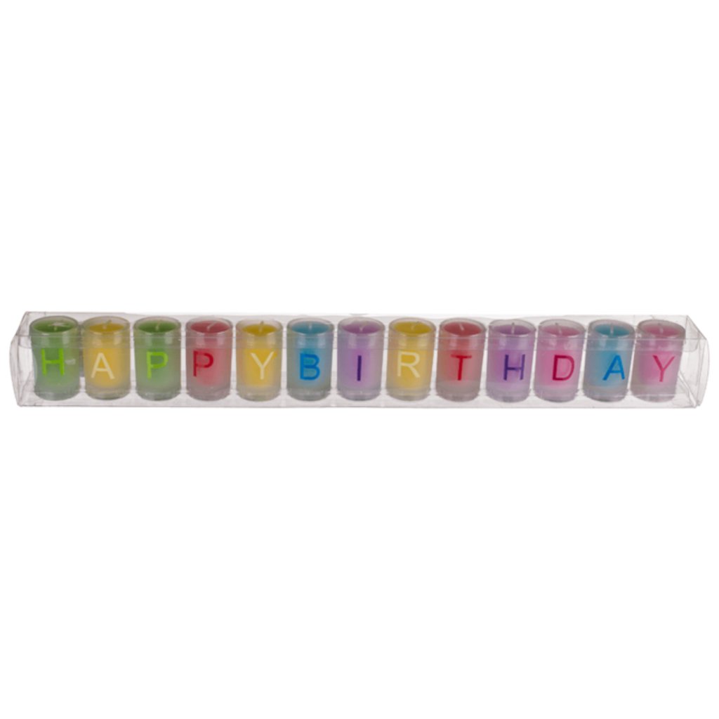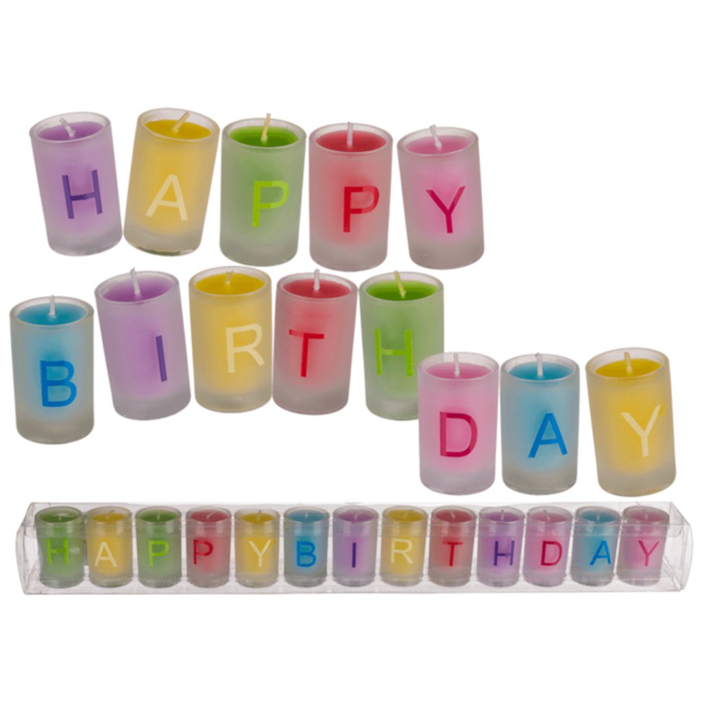 Farebná sviečka v skle, Happy Birthday, cca 3 x 5 cm, sada 13 kusov