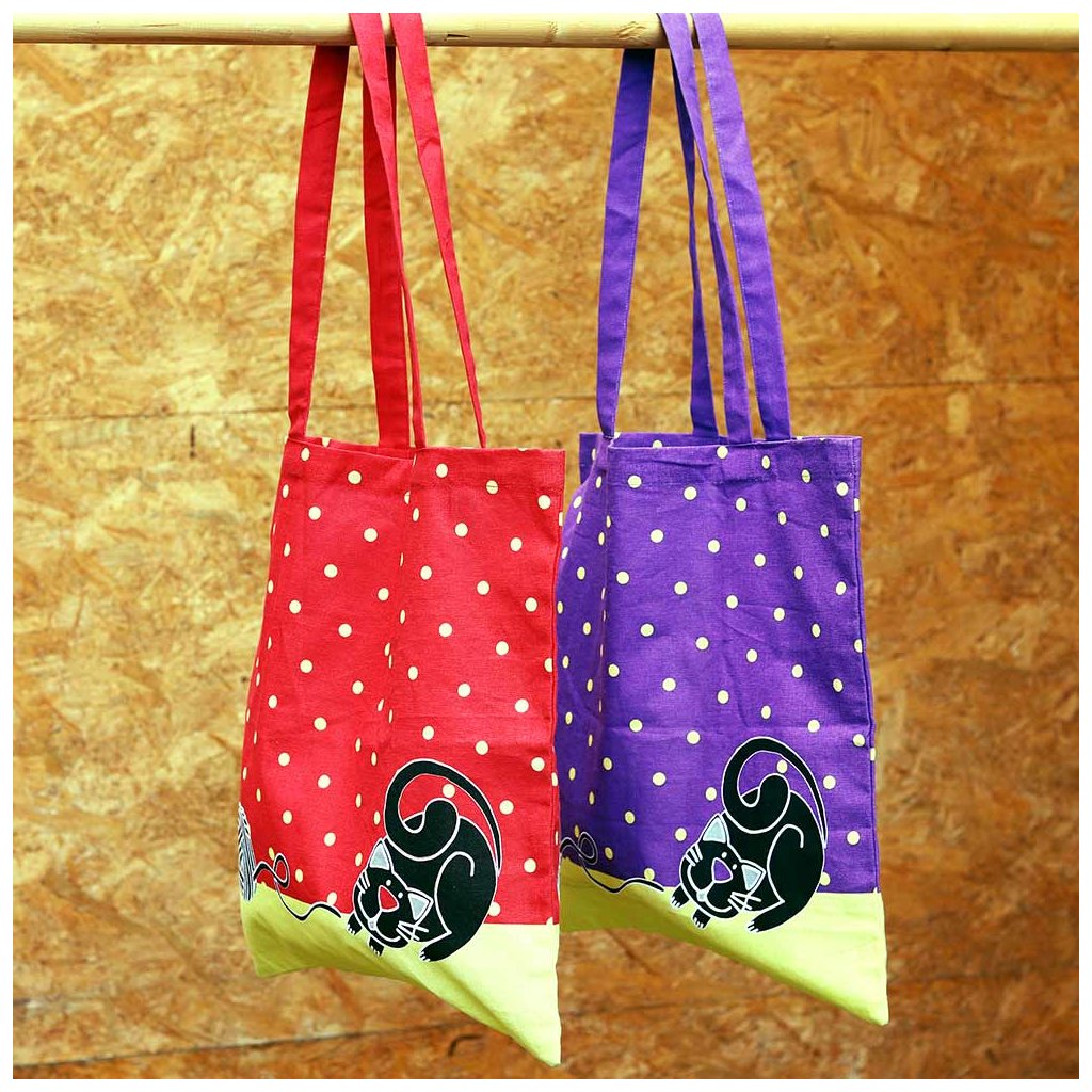 Červená výrazná látková taška s roztomilou mačkou sa výborne hodí na každodenní nákup. Taška unesie veľkú váhu, pretože je vyrobená z kvalitní bavlny.